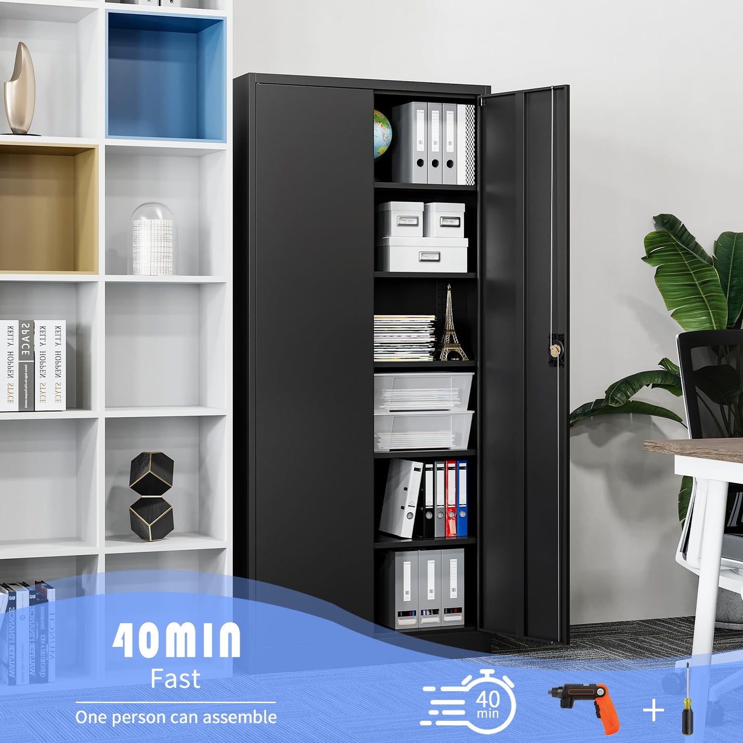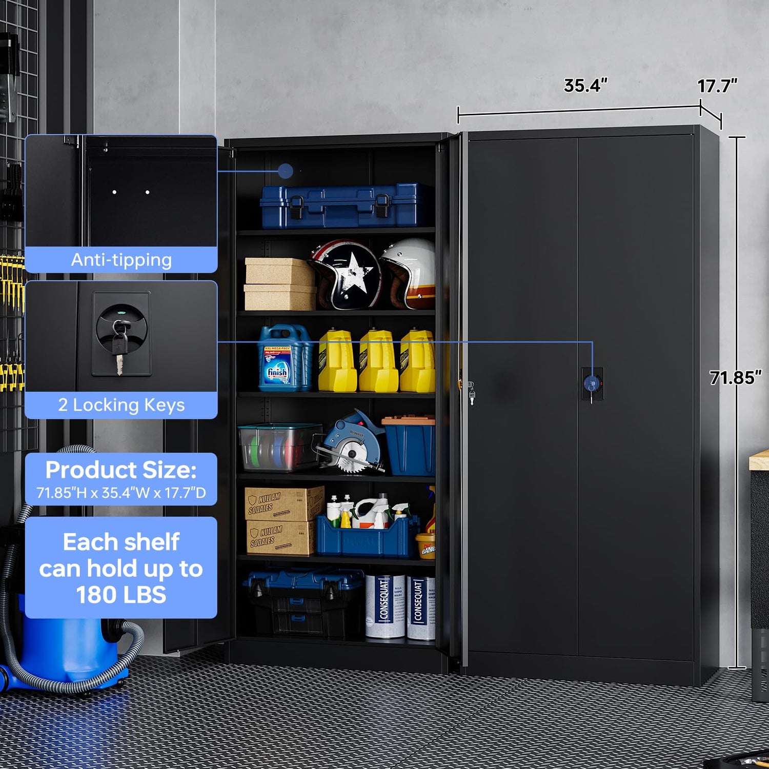 Yizosh Metal Garage Storage Cabinet with Lock, 72" Locking Tool Cabinet with 2 Doors and 5 Shelves, Tall Steel Cabinet for Garage, Heavy Duty File Cabinet for Office, School (Black)