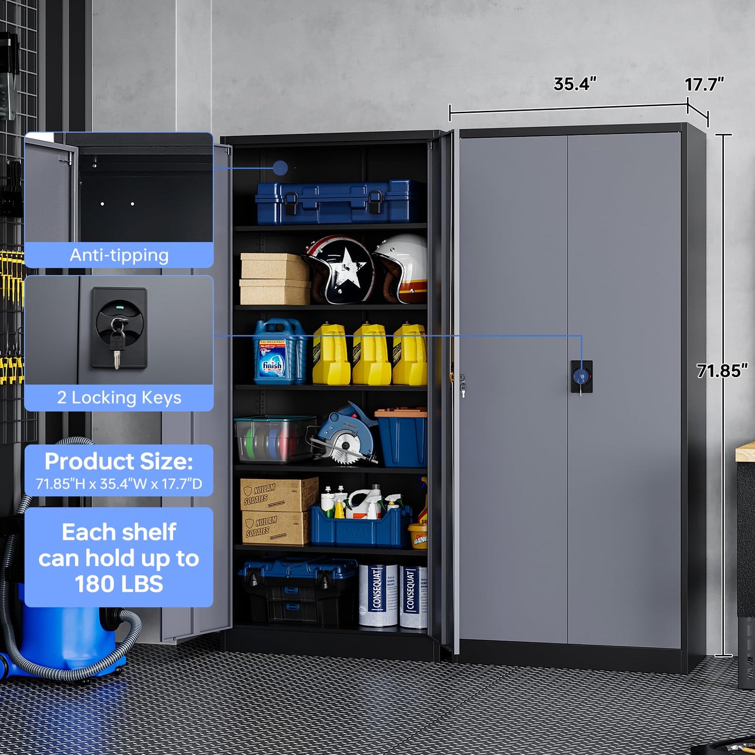 Yizosh Metal Garage Storage Cabinet with Lock, 72" Locking Tool Cabinet with 2 Doors and 5 Shelves, Tall Steel Cabinet for Garage, Heavy Duty File Cabinet for Office, School (Gray Black)