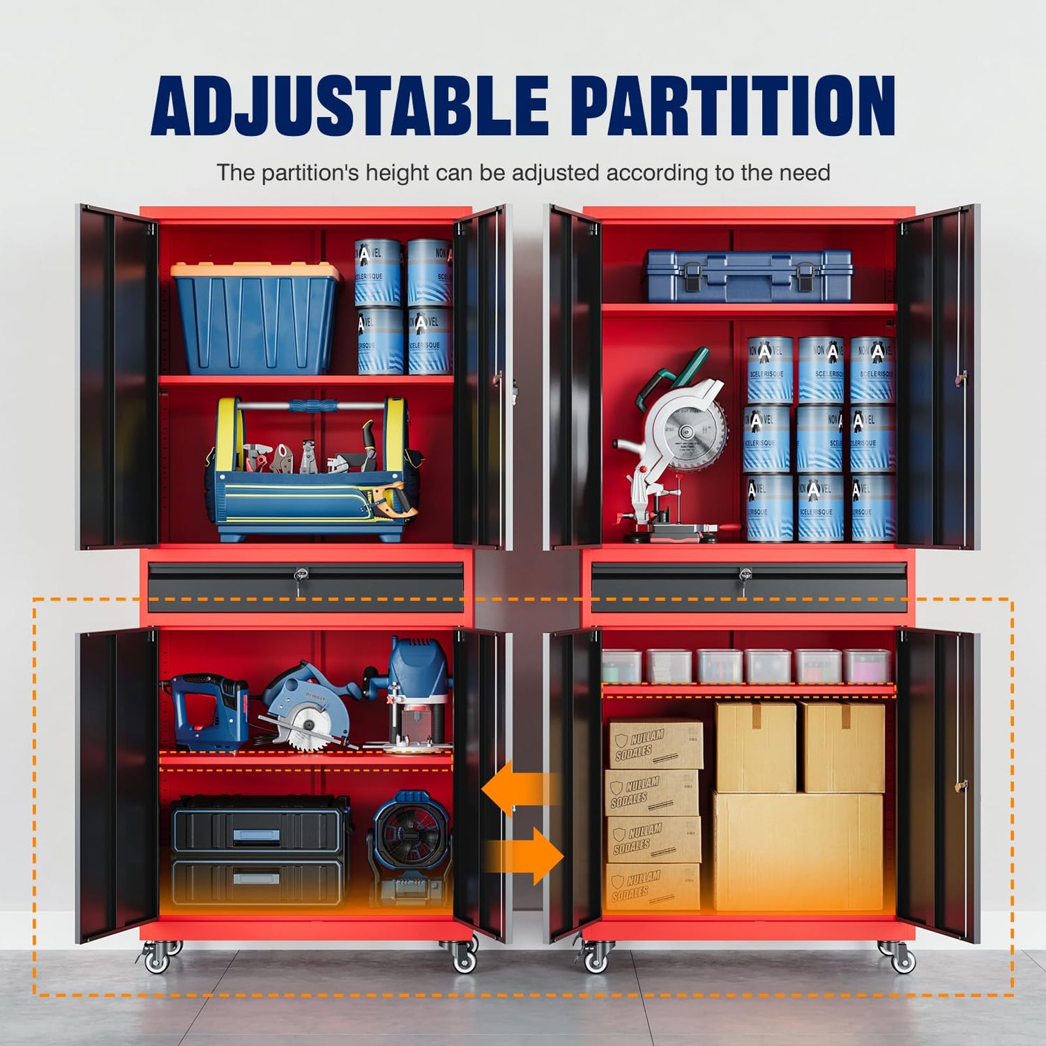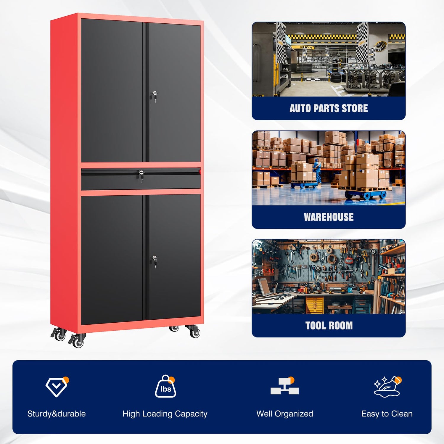 Yizosh Metal Garage Storage Cabinet with Locking Doors and Adjustable Shelves, Rolling Tool Storage Cabinet with 4 Wheels and 1 Drawer - 73" Steel Locking Cabinet for Garage, Warehouse (Red Black)