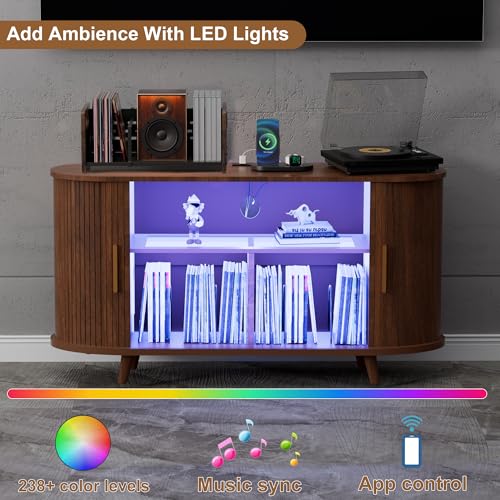 YKVIQBY Large Round Record Player Stand with Charging Station & USB Ports,Record Storage Cabinet for Bedroom (Walnut, 55in)