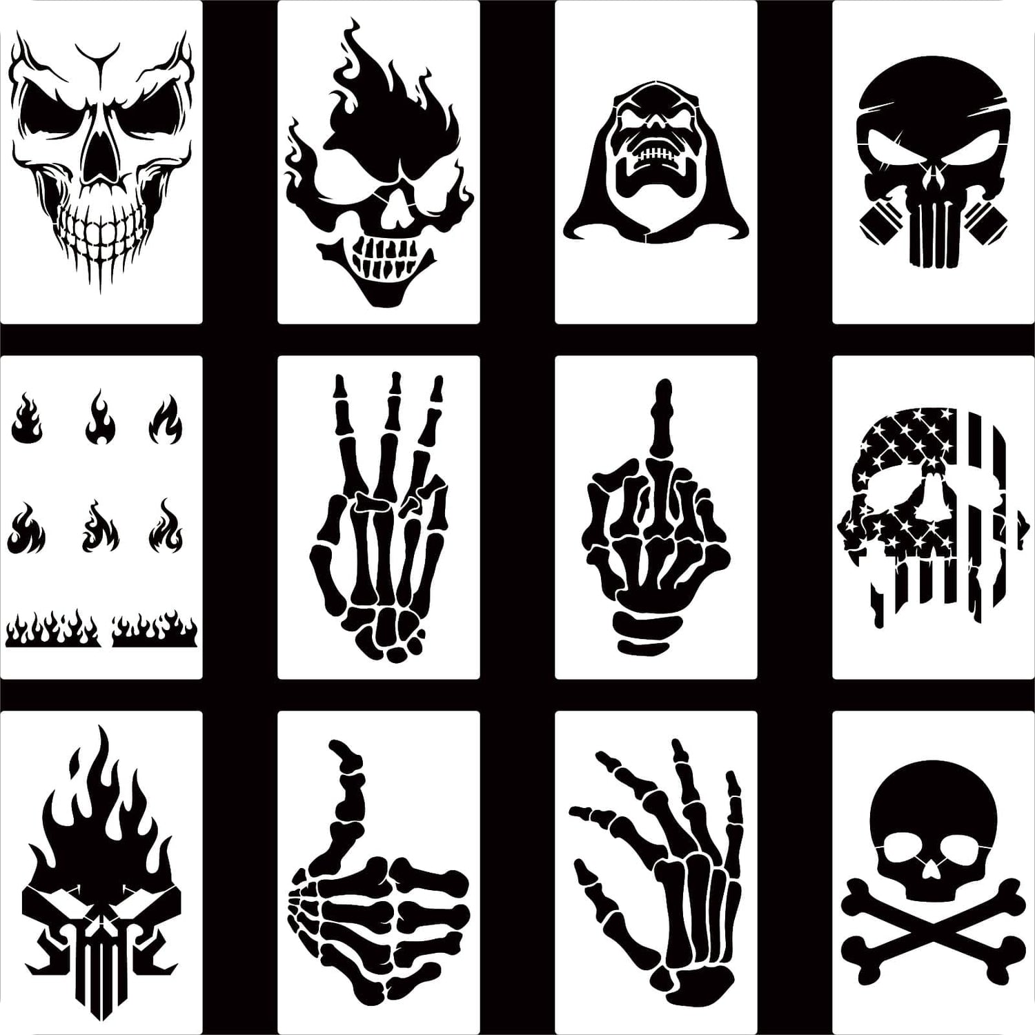 - Versatile Skeleton Stencils: Our YKW Skull Stencils set includes 12 reusable templates featuring various skull、flame and skeleton hand designs. Perfect for airbrush stencils, wood burning stencils, and stencils for spray painting, these templates are ideal for any DIY art project.
