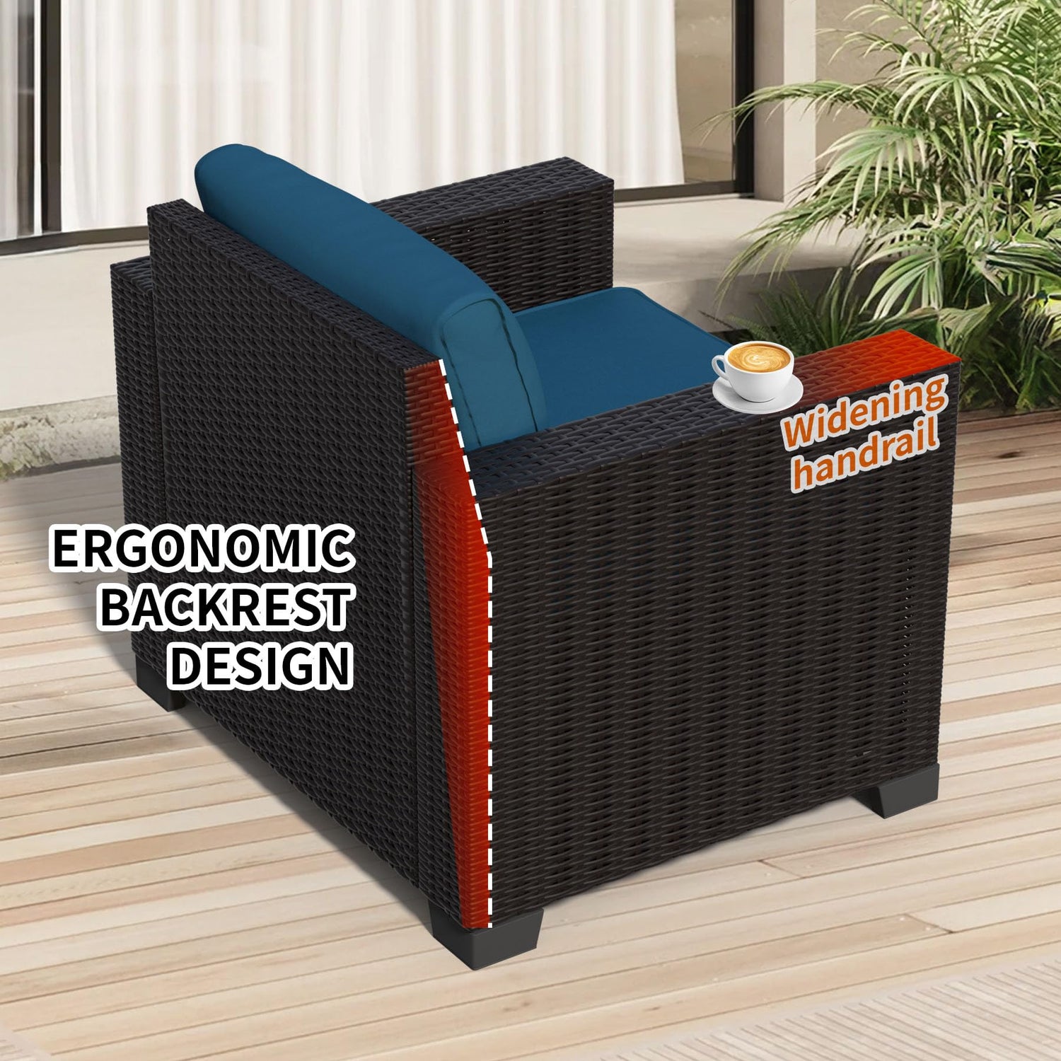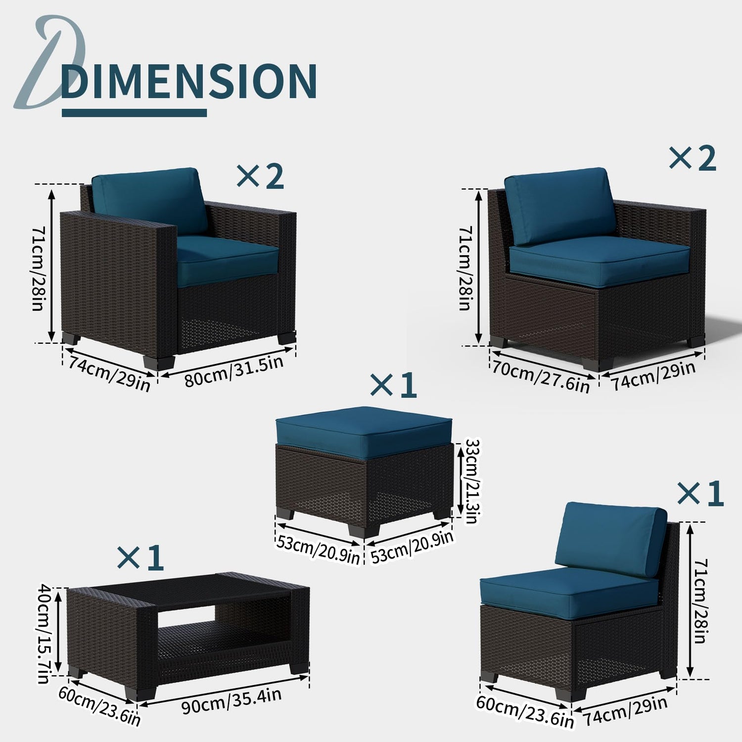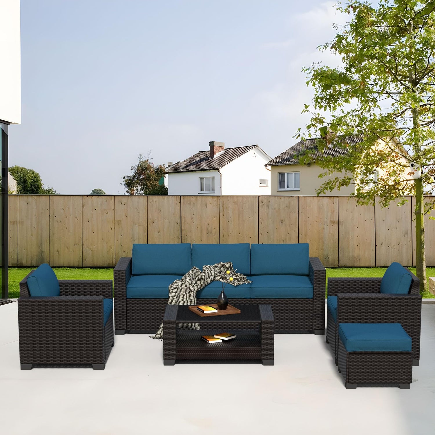 YLGJ&TIDY 7-Piece Outdoor Sectional Patio Furniture Set, All-Weather Wicker Rattan Sofa w/Thick Washable Cushions & Tempered Glass Table, Perfect for Garden, Poolside, Backyard (Darkbrown&Lake Blue)