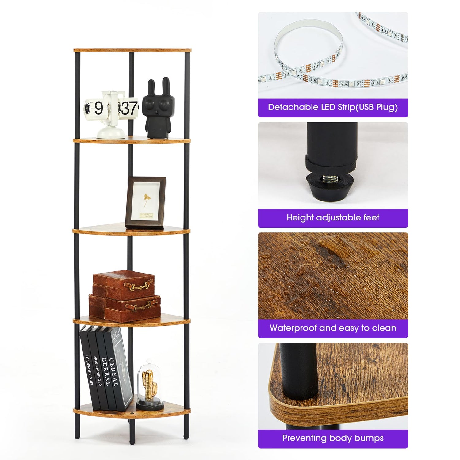 Ymesiyou 5-Tier Corner Bookshelf with LED Light, Corner Bookshelf for Tight Spaces, Narrow Display with Storage Rack, for Living Room, Bedroom, Metal Display Shelf