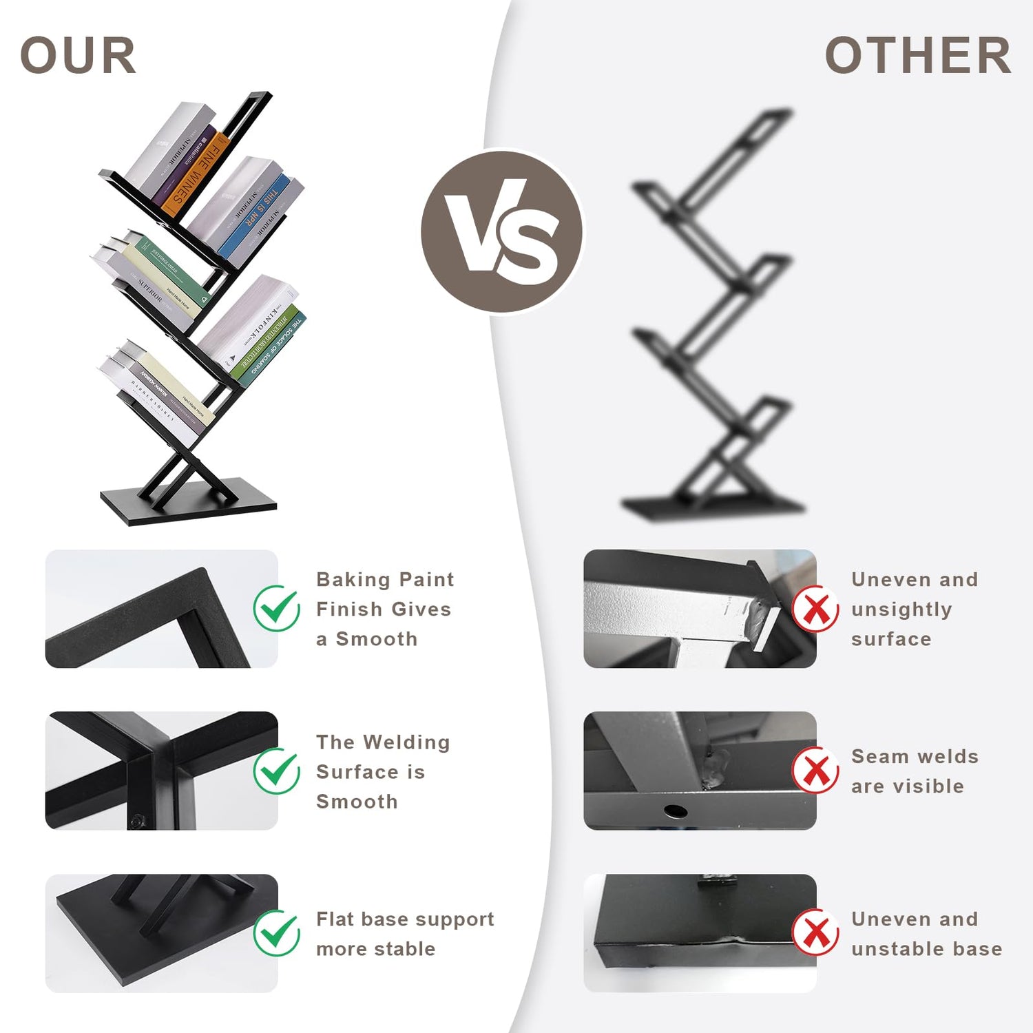 - Sturdy and Stable Construction: The wisdom tree bookshelf features a compact size of 15.74"(L) x 9.8"(W)x 41.73"(H) and is crafted from thick tubular iron, providing a strong and durable frame. The triangular base design enhances stability, ensuring it can bear substantial weight without tipping over. The high-temperature nano baking paint finish gives a smooth and rust-resistant surface, while the cotton pads at the bottom protect your floors from scratches.