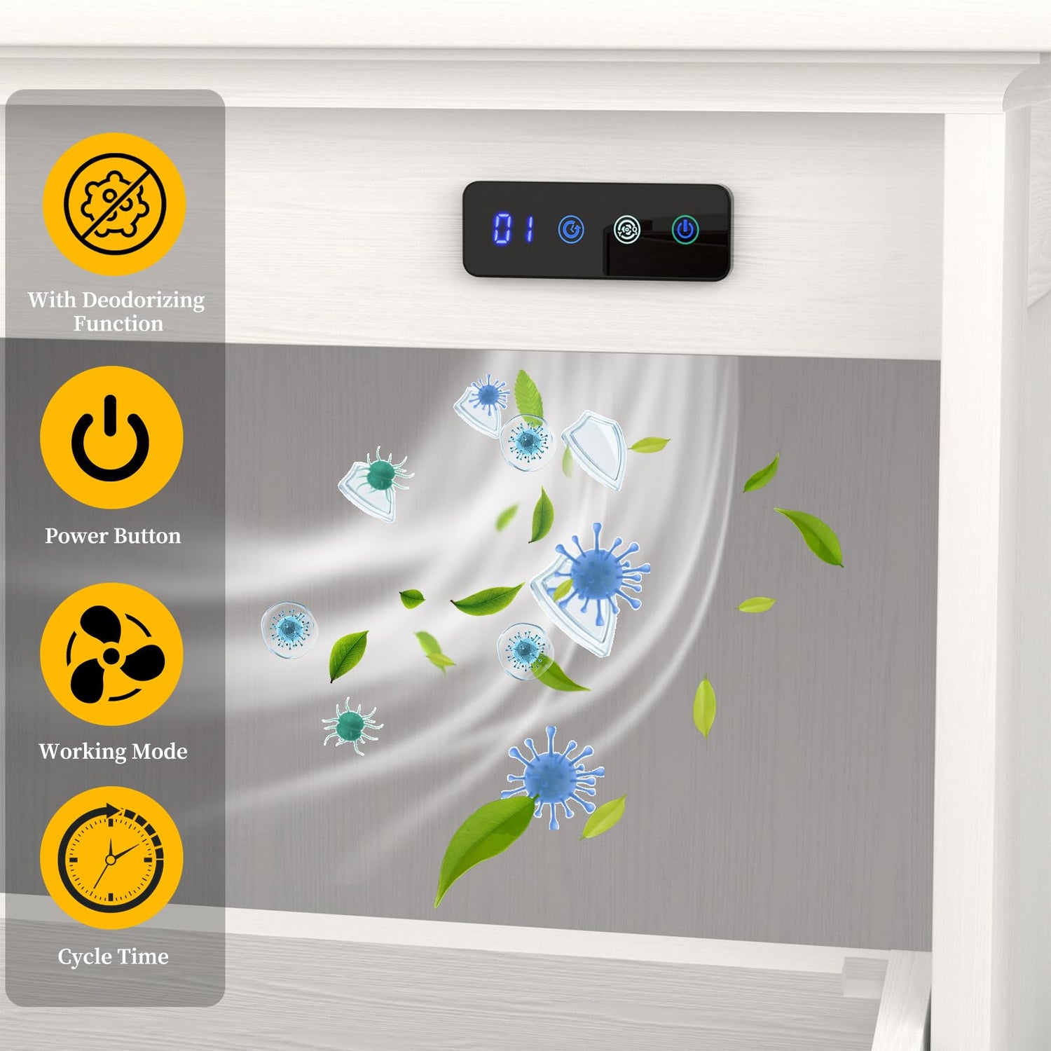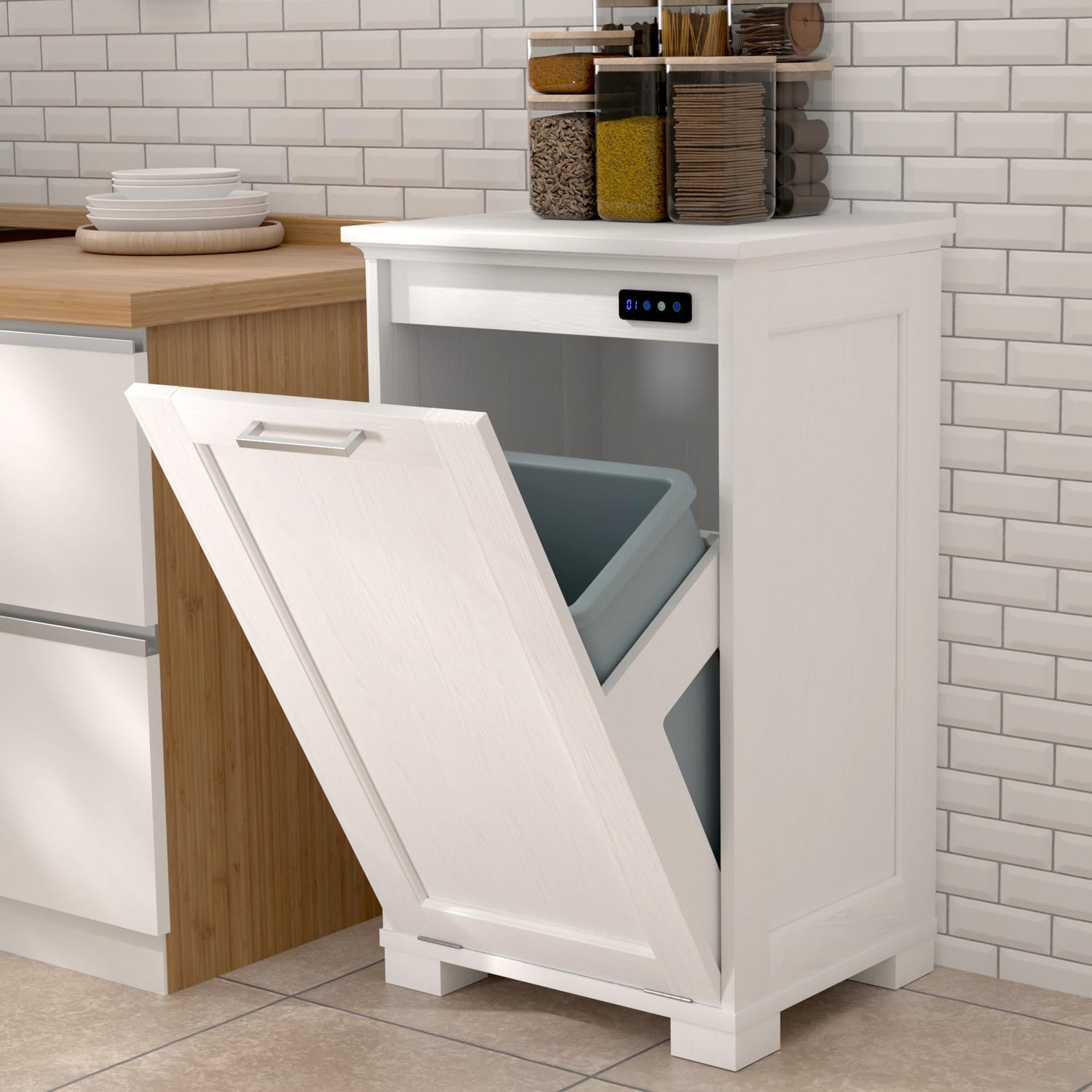 - 【Trash Can Cabinet with Deodorising】 The tilting trash can cabinet with deodorizing function and negative ions effectively removes odors and harmful substances to maintain a fresh environment!