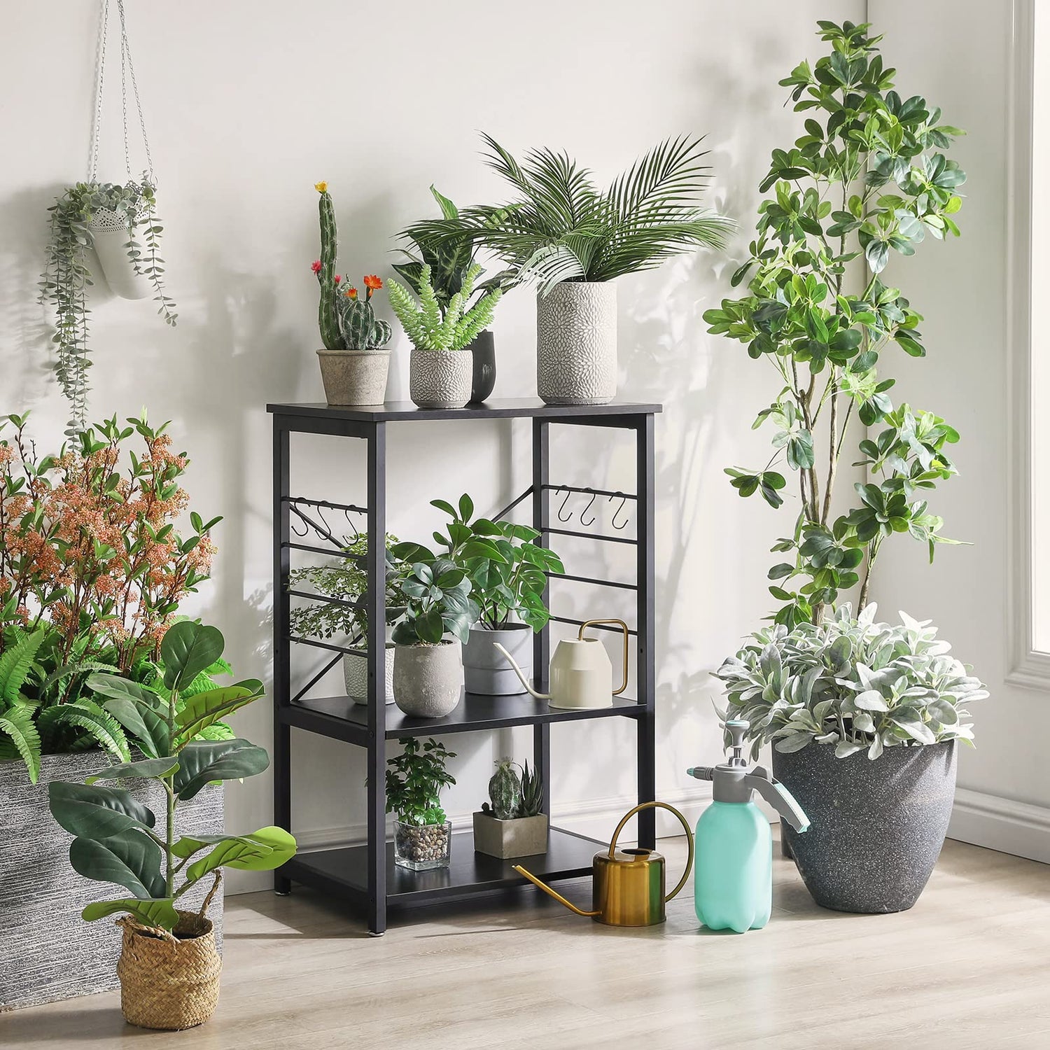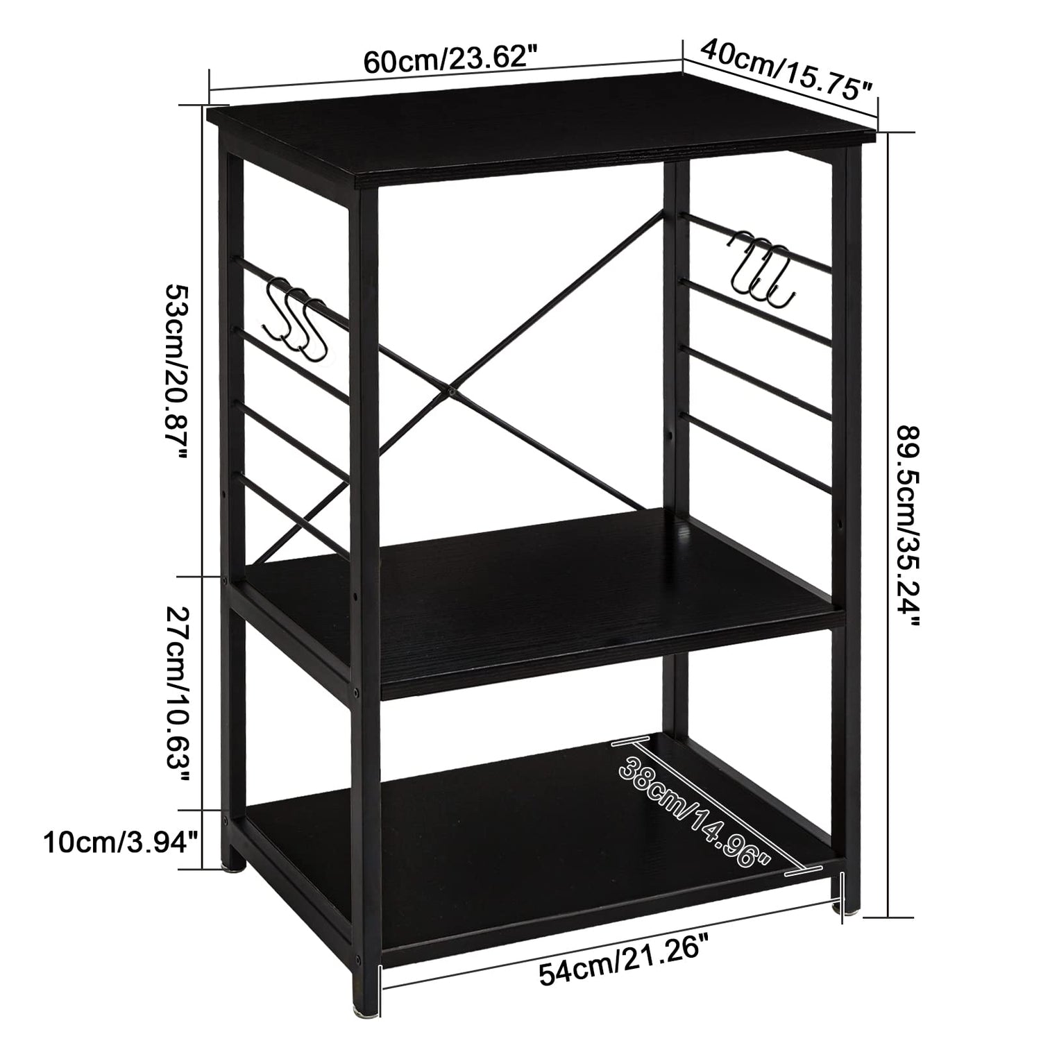 Details: YMYNY Standing Baker's Racks, 3-Tier Microwave Oven Stand with Metal Frame and 6 Hooks, Coffee Bar Table, Storage Shelf Rack for Kitchen and Living Room, Panel Adjustable, Black, HTMJ022B