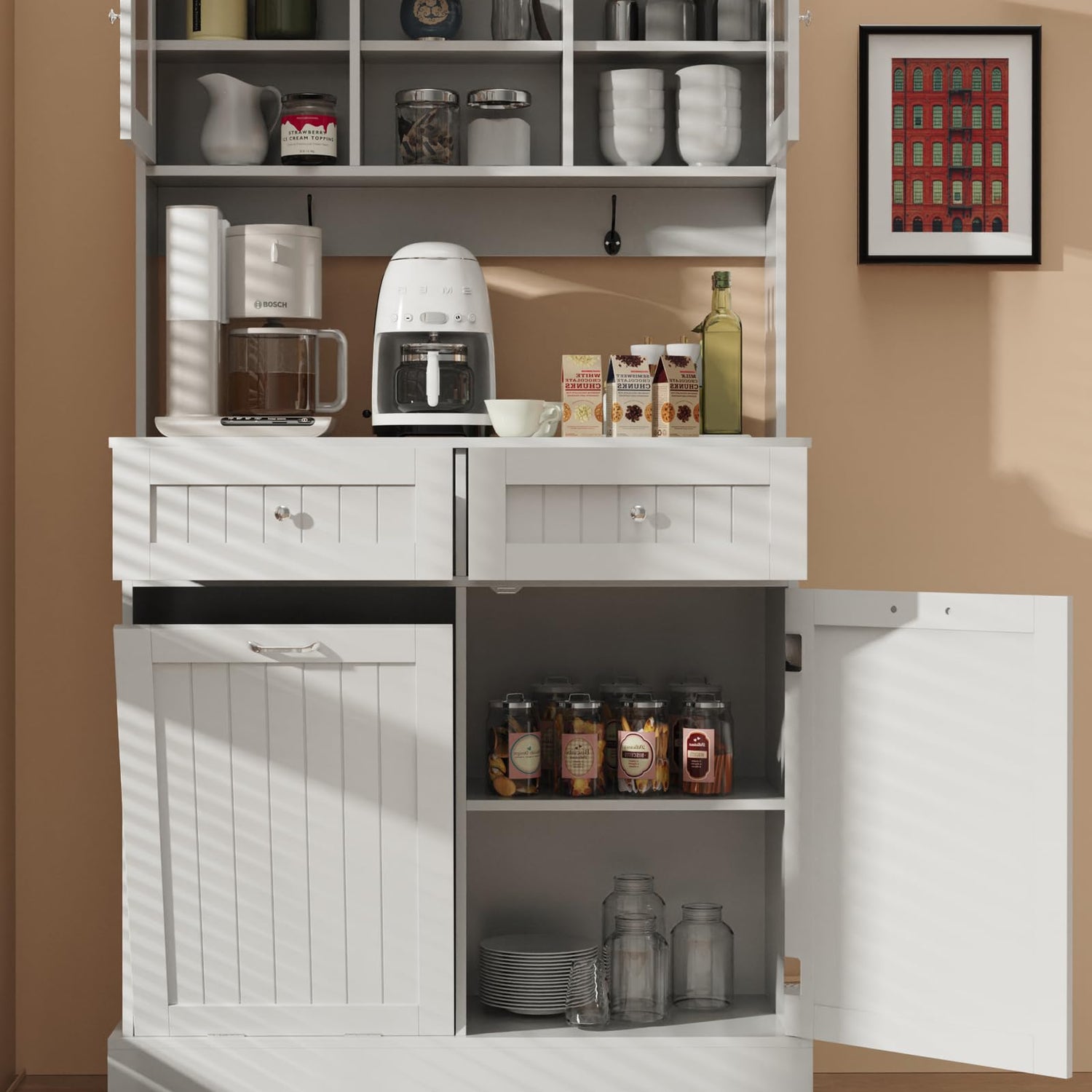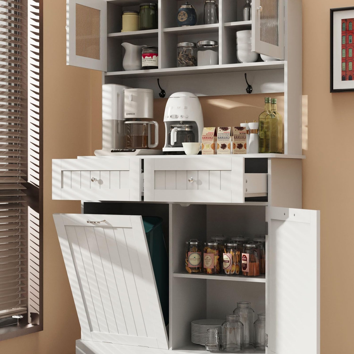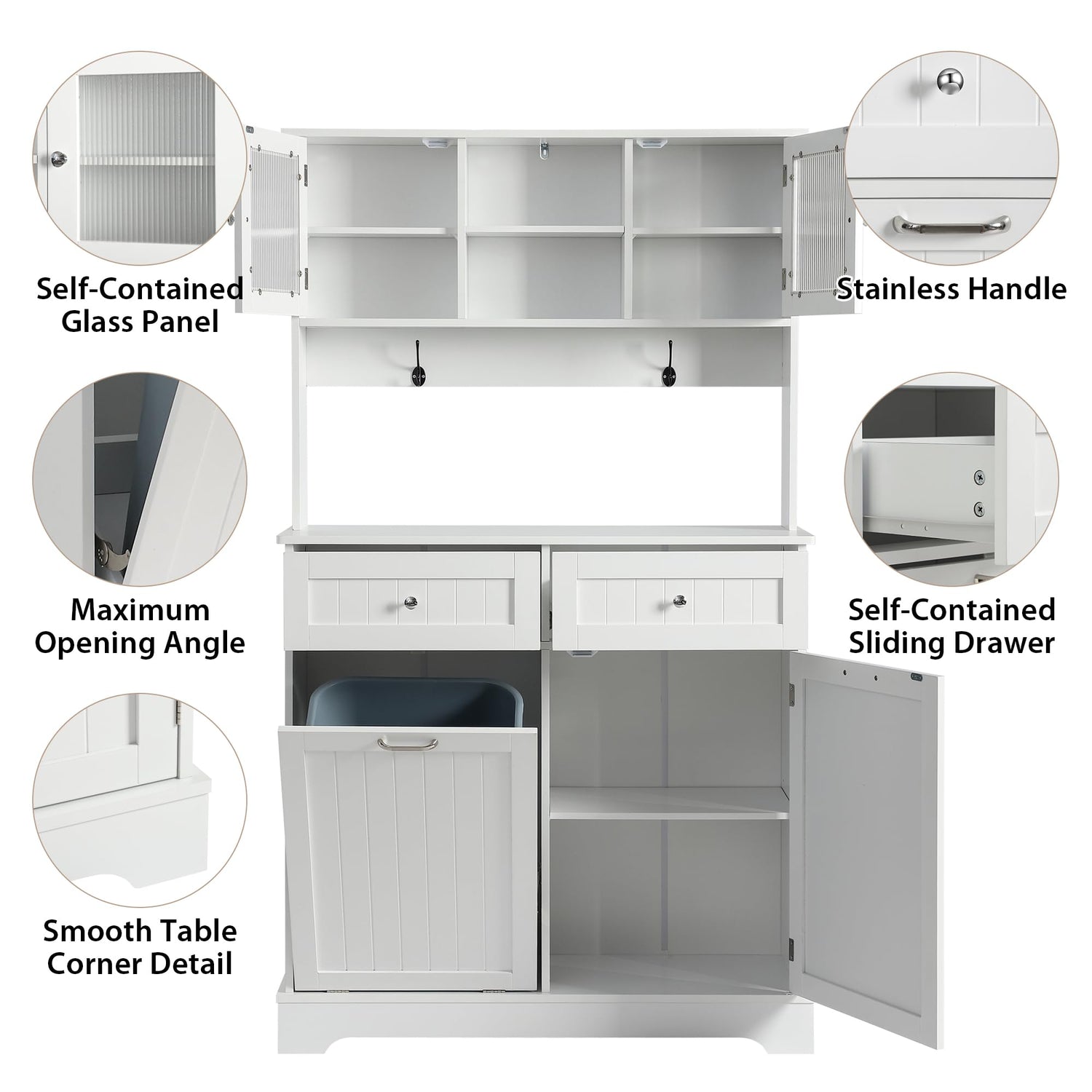 - Hidden Design: Our tilt out trash cabinet can be pull out and tilt to 30 degree, is a perfect storage cabinet with extra two drawers, saving space and keep tidy. Large capacity but effectively avoid odors