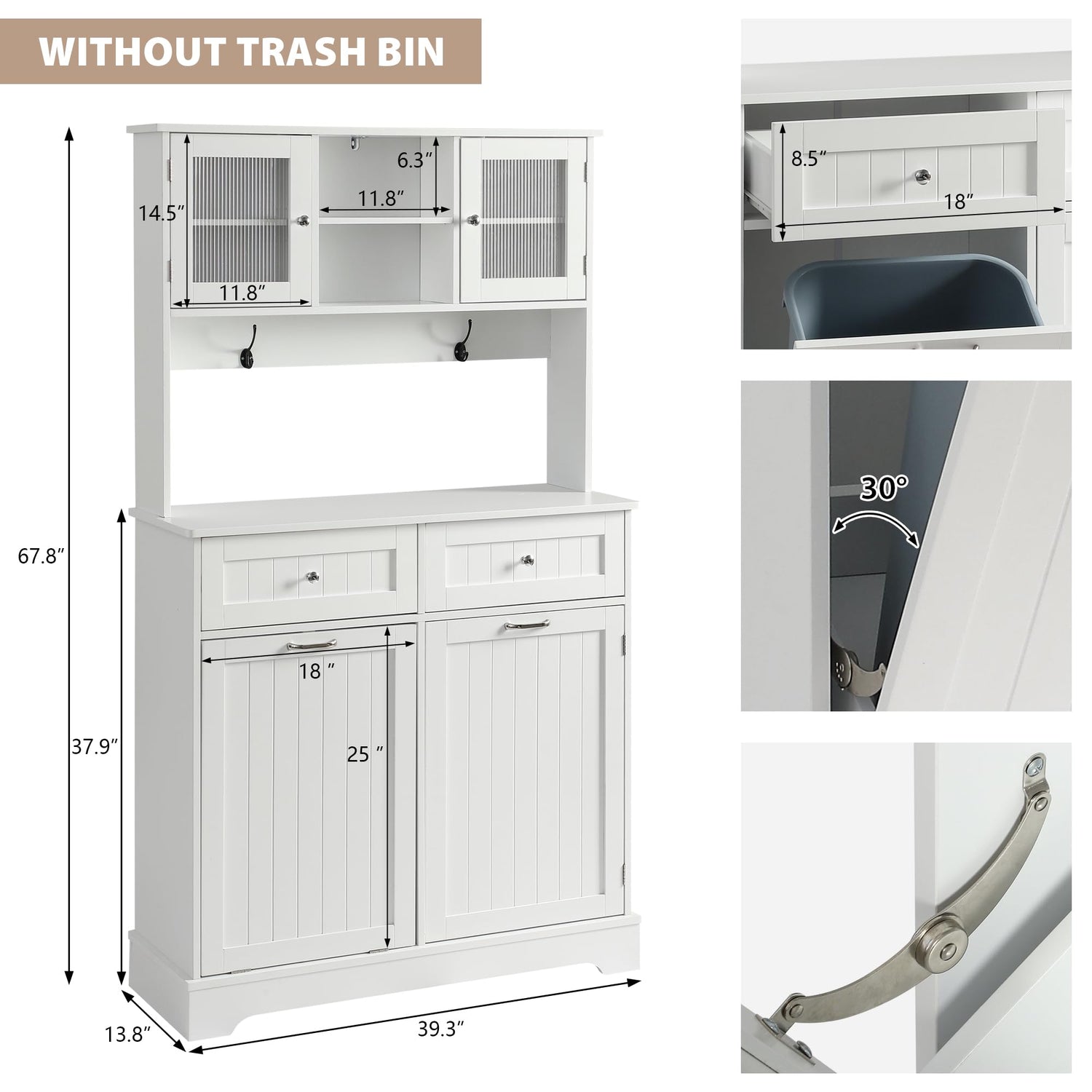 - Details and Dimension: Total 67.7 " H x 39.3 " L x 13 " W, double trash can under cabinet 35.8 " H x 39.3 " L x 13 " W, which fits up to two 10 Gallon Trash Can, this product does not contain a trash can