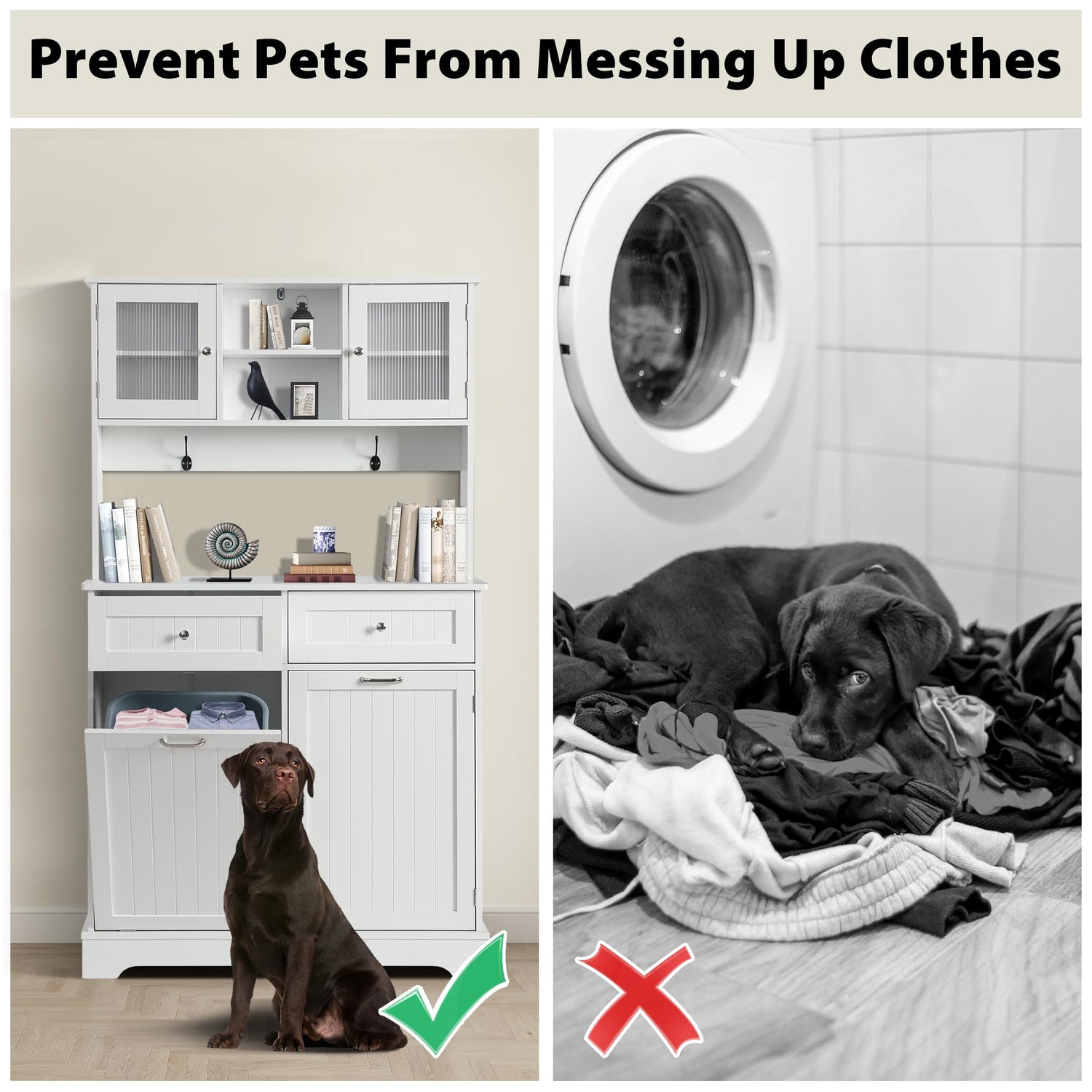- Versasile and Stylish: The trash can cabinet is perfect for dressing up your living room, kitchen, laundry. It is a combination of cabinet and trash can, you can storage pet foods, and the top can be used to place decoratives, daily supplies