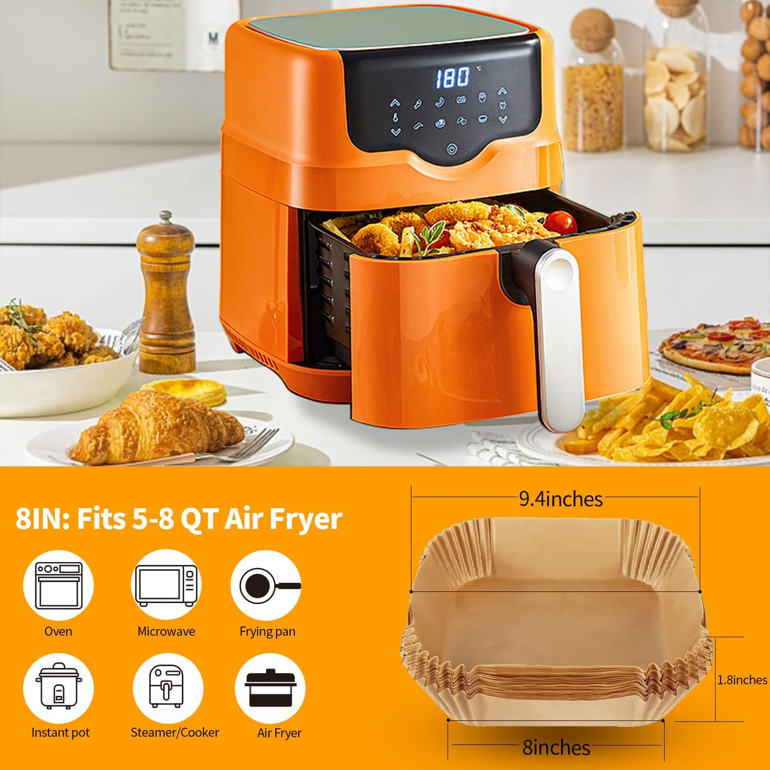 - 【Convenient Quantity】: Our 8-inch air fryer liners square are pre-cut and tailored to fit your 5 to 8 Qt air fryer precisely. They fit These air fryer parchment paper liners eliminate the need for cutting or measuring, saving you time and effort after cooking. They keep your air fryer free from food residue, grease, and grime while maintaining its longevity.