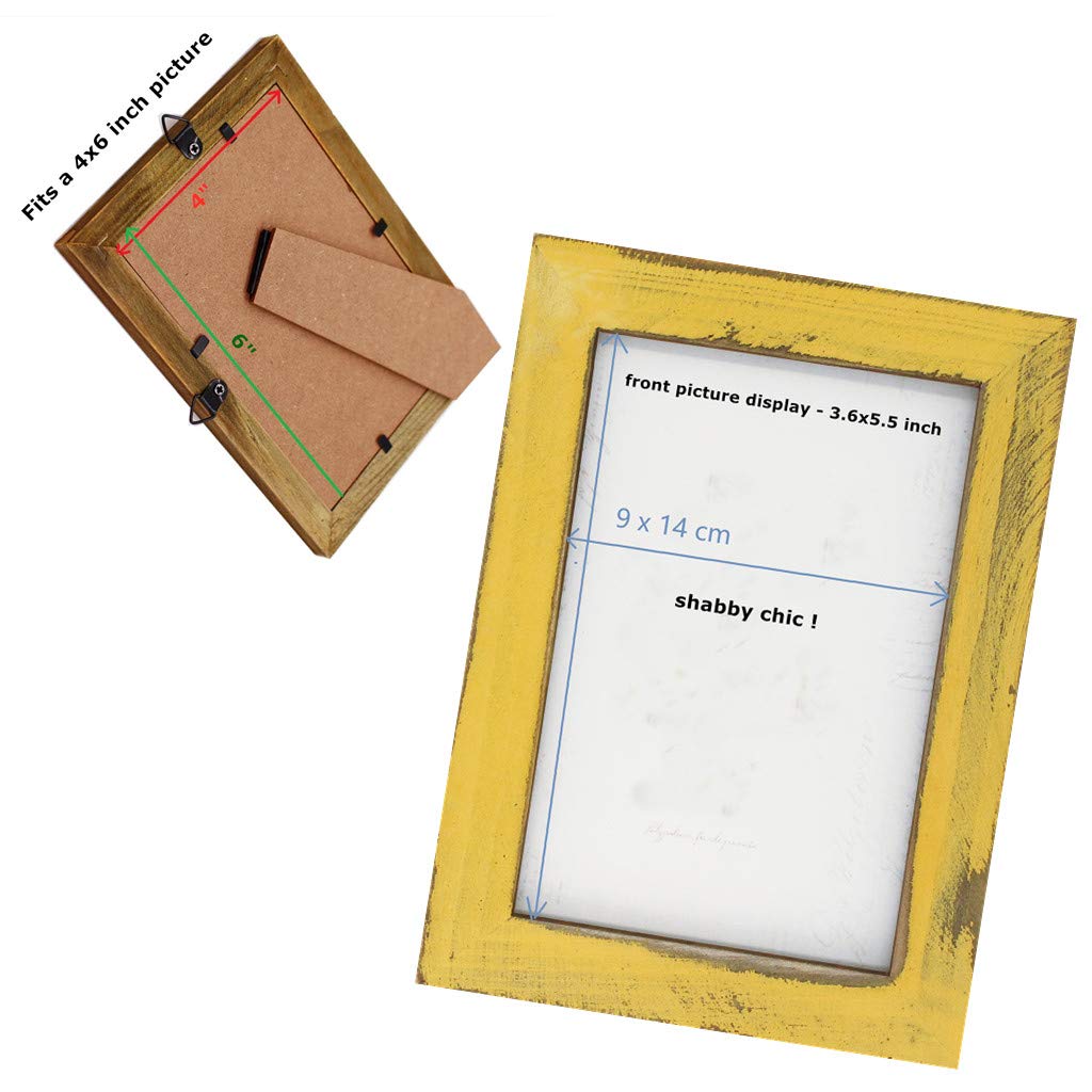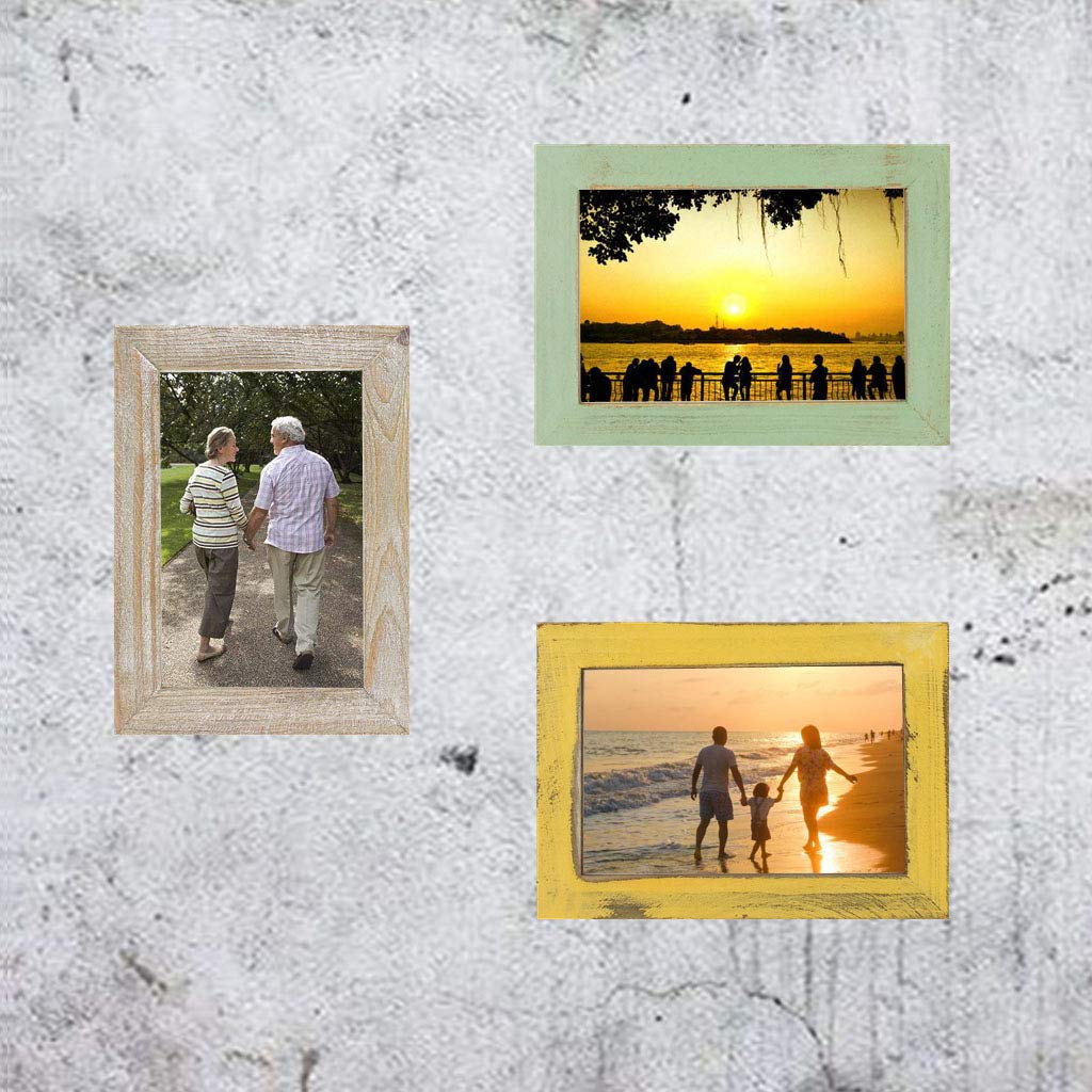 Details: Packing included: 3 pcs farmhouse distressed table picture frames, 3 color, they are yellow, light green, and old wooded color.