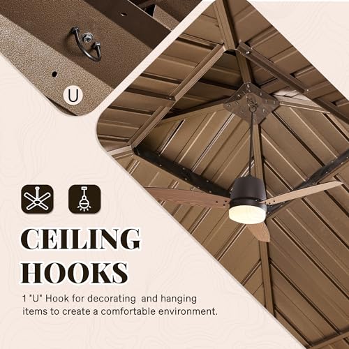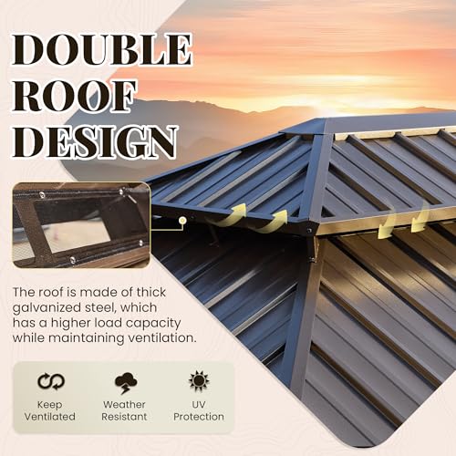- GALVANIZED STEEL DOUBLE ROOF: This patio gazebo has a double-layer galvanized steel roof that offers great ventilation and airflow. Its sturdy construction provides protection against wind, rain, and snow, while the galvanized steel material ensures thermal insulation, waterproofing, and noise reduction.