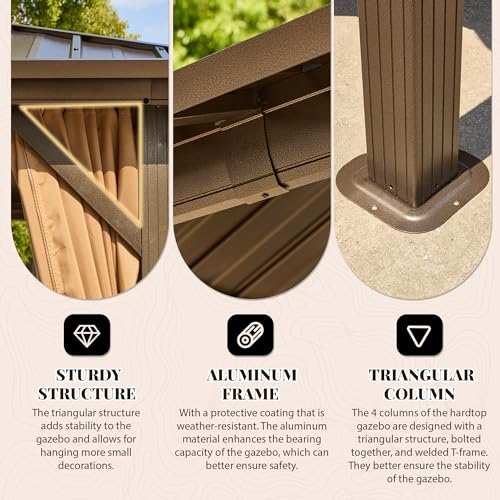 - ALUMINUM FRAME: Sturdy permanent hardtop gazebo built with triangular powder-coated aluminum frames, which are more stable and durable than the standard. The 10x10 gazebo with pre-drilled bases is designed for various kinds of ground and can be installed in different outdoor situations.