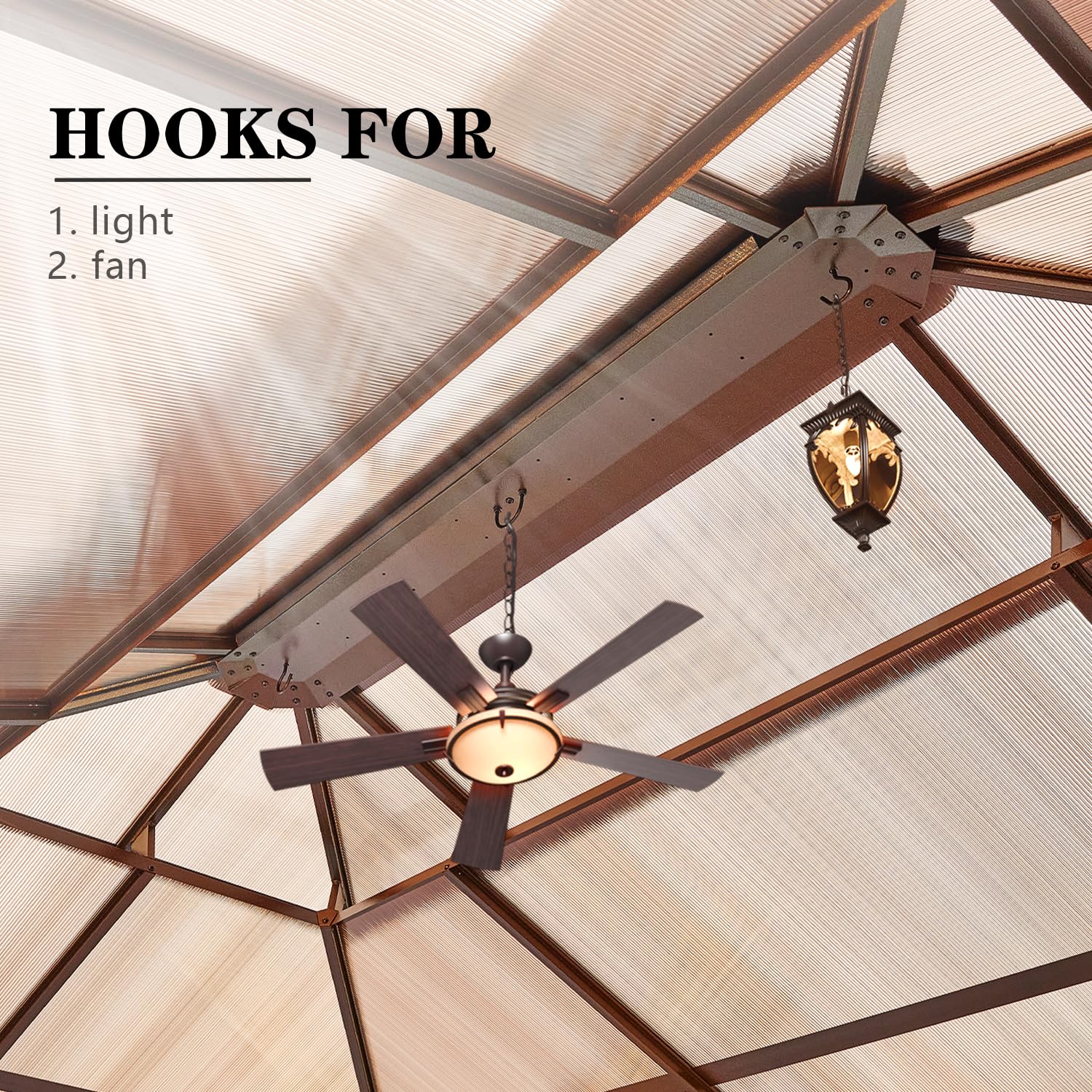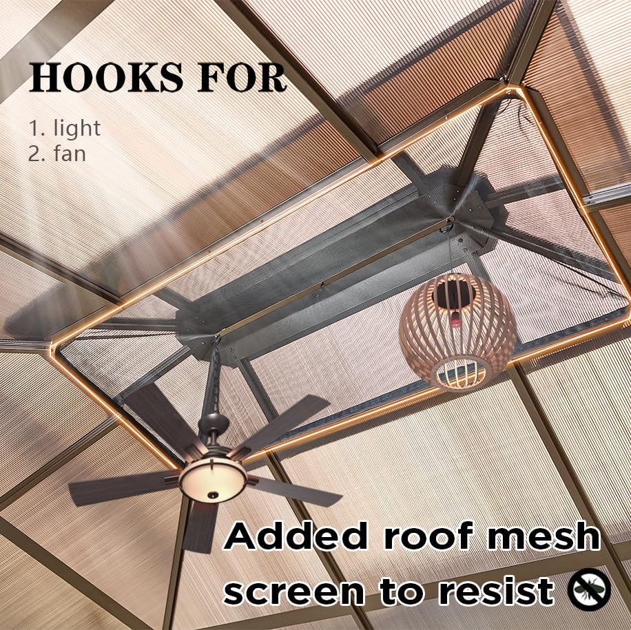 - DOUBLE TOP DESIGN: For fuller protection and fresher air, our patio gazebo features a ventilated, double-layer polycarbonate roof. It prevents harmful UV rays while allowing air circulation and helps withstand wind. You can sunbathe under this pavilion without worrying about getting sunburned. *Please note that the polycarbonate roof can only block UV rays, not high temperatures and strong light.