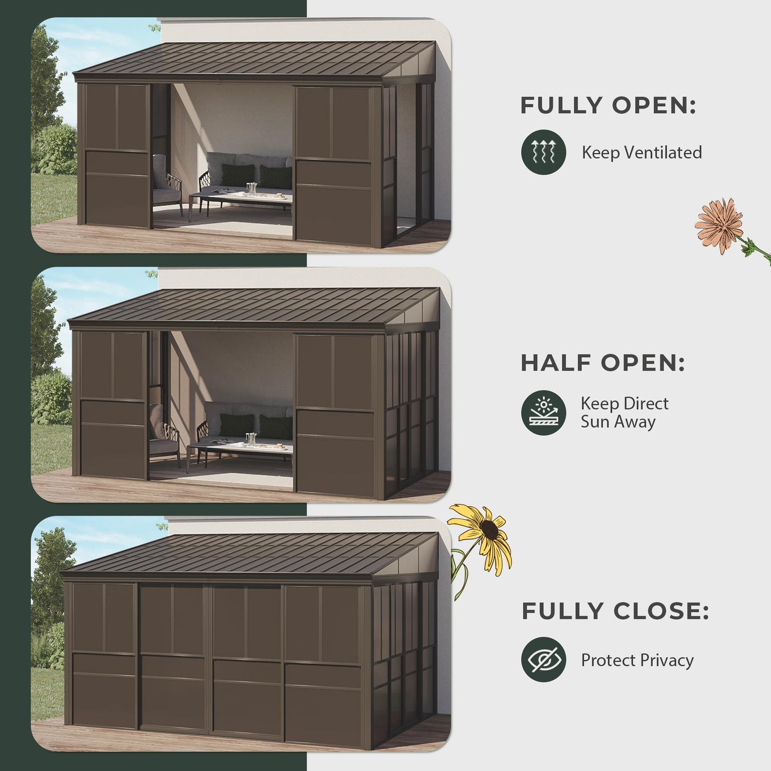 YOLENY 10x14FT Sunroom,Wall Mounted Gazebo Solarium with Front Door, Both Side Entrance, Galvanized Steel Sloping Roof, Moveable PC Screen, Outdoor Permanent Sun Room Lean to Gazebo for Deck Patio