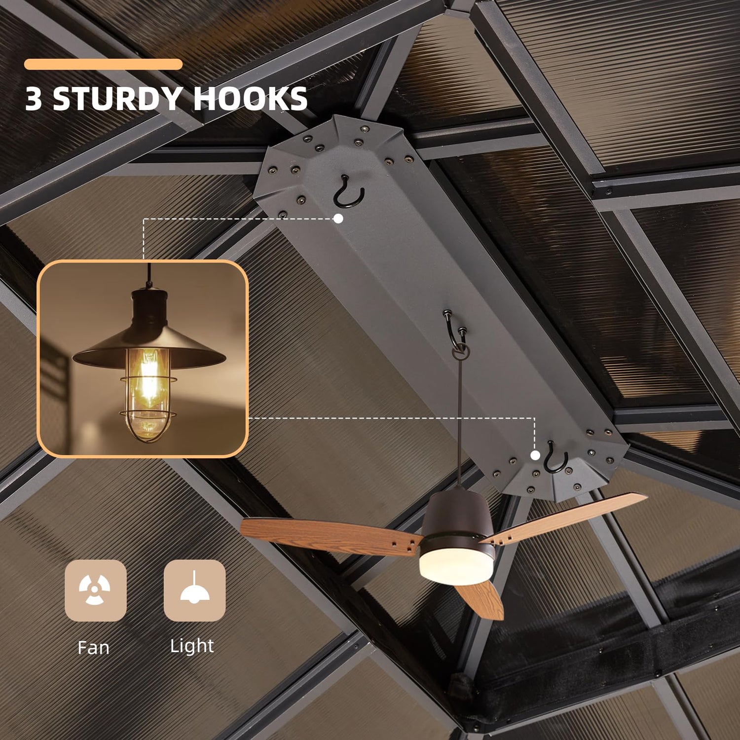 - 【Light Up Your Outdoor Patio】-The top of this backyard gazebo offers two practical J-hooks and a sturdy U-hook, which can be used to hang lights, fans, etc., which will allow you to enjoy the outdoor hardtop gazebo in the evening and in the summer as well, and the three hooks also mean more versatility, so you can hang as many items as you want.