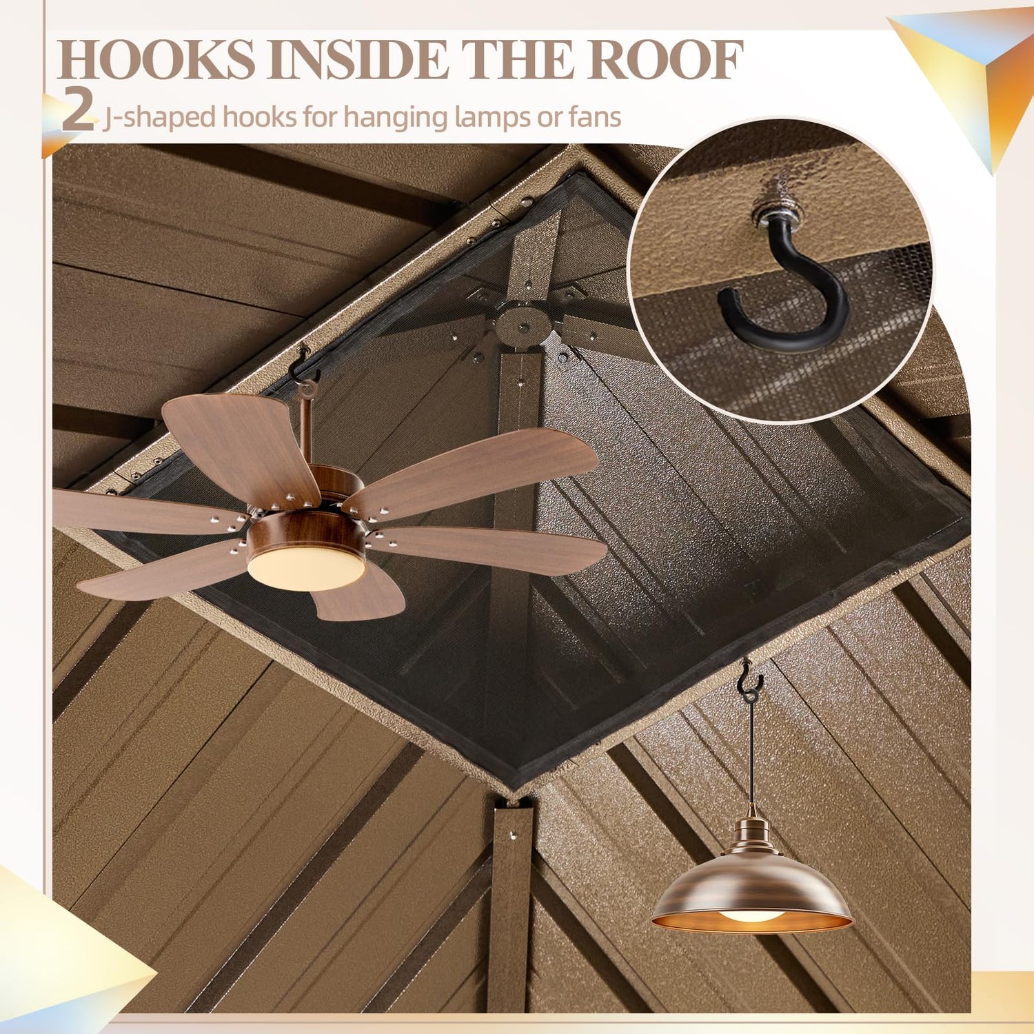 - 【Galvanized Steel & Dual-layer Roof】 Our courtyard hardtop gazebo features a dual-layer roof design that promotes excellent ventilation and airflow while effectively shielding against harmful UV rays. The galvanized steel roof ensures superior stability. The built-in "J" hooks cater to various hanging needs conveniently.