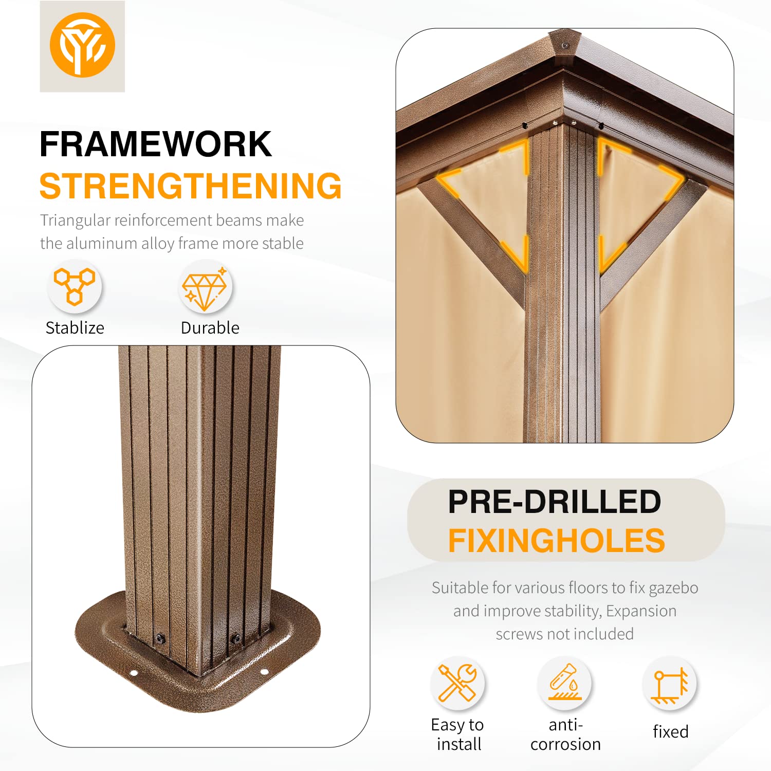 - 【RUSTPROOF ALUMINUM FRAME】Sturdy permanent hardtop gazebo built with 4.8"x4.8" triangular powder-coated aluminum frames, which are more stable and durable than the standard. The pavilion gazebo with pre-drilled bases is designed for various kinds of ground and can be installed in different outdoor situations.
