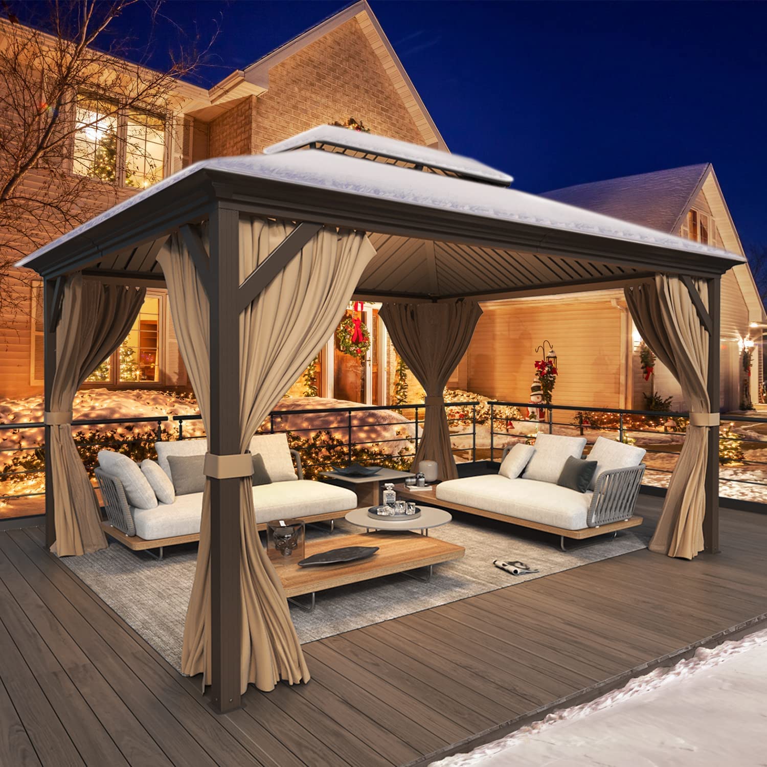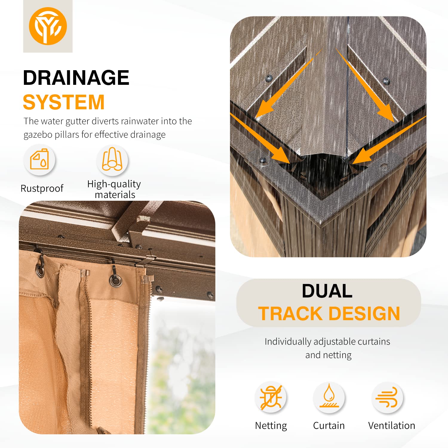 YOLENY 12' x 14' Hardtop Gazebo, Galvanized Steel Metal Double Roof Aluminum Frame Gazebo with Curtain and Netting, Permanent Pavilion Pergola for Outdoor, Patio, Garden, Lawn, Pool Side, Brown