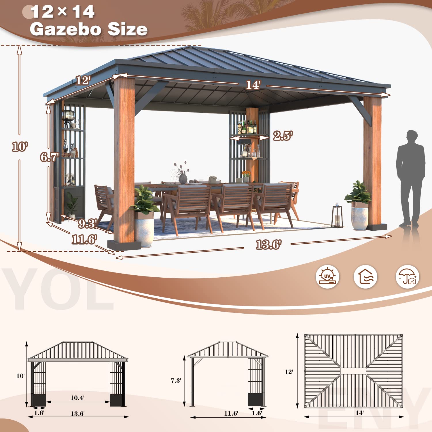 YOLENY 12' x 14' Ultra-Thick Columns and Beams Hardtop Gazebo, Faux Wood Grain Metal Gazebo with Storage Shelves, Vertical Stripe Galvanized Iron Roof, Outdoor Patio Gazebo for Patio