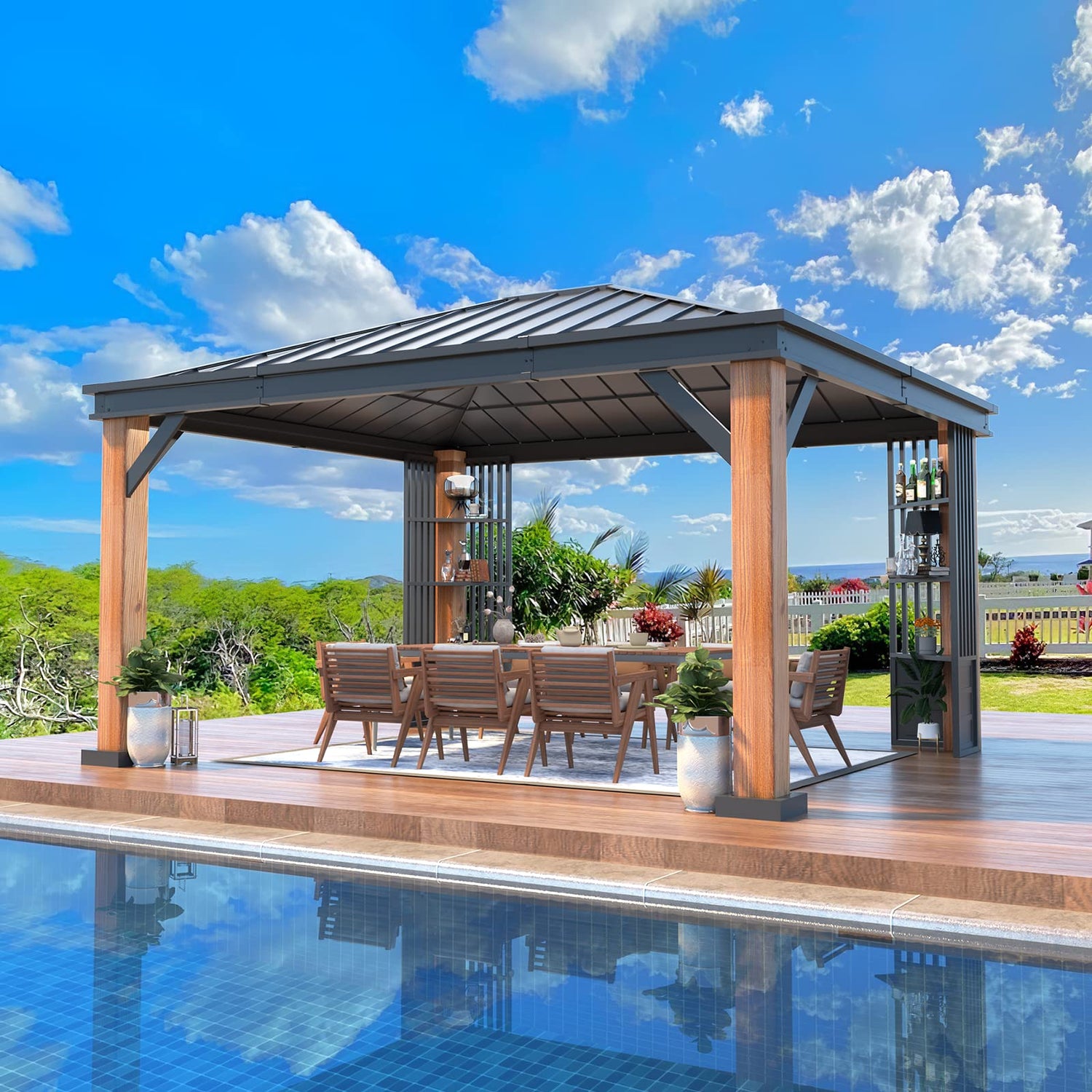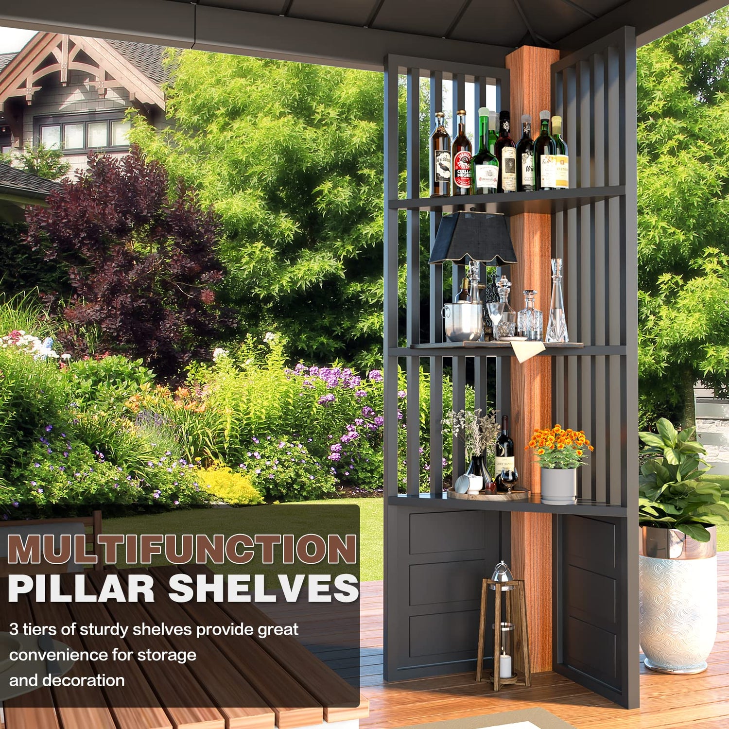 - 【STRORAGE PILLAR】-Unique gazebo with a storage function, the three-layer sturdy shelves on the pillars allow you to store fruits, wine glasses, snacks, and other common items, as well as place decorative pieces to enrich your outdoor garden life.