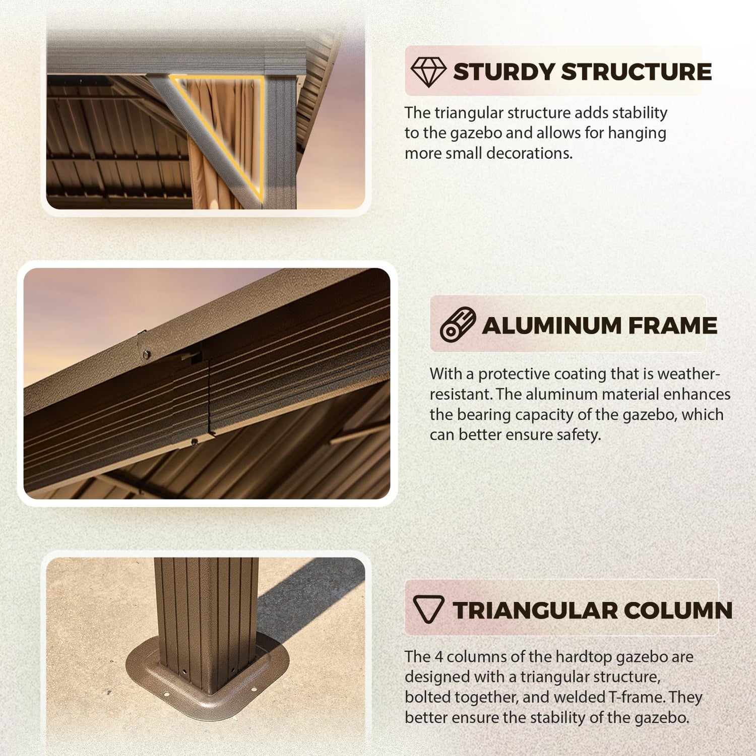 - 【STURDY COLUMNS】 - The columns of the outdoor gazebo are designed with a triangular structure, bolt connections, and welded T-frame. They better ensure the gravity and stability of the gazebo, which can let you and your family enjoy outdoor life more easily and securely.