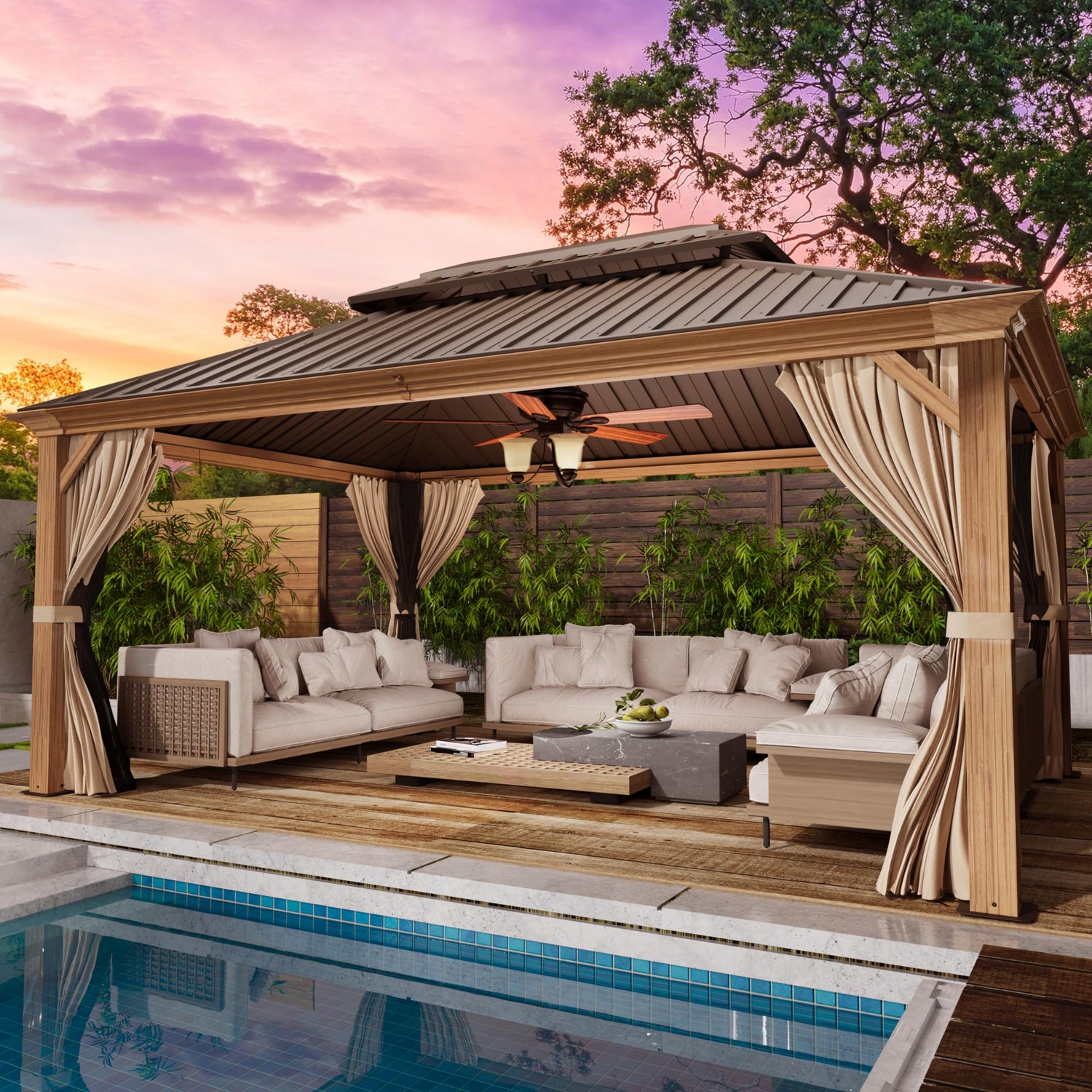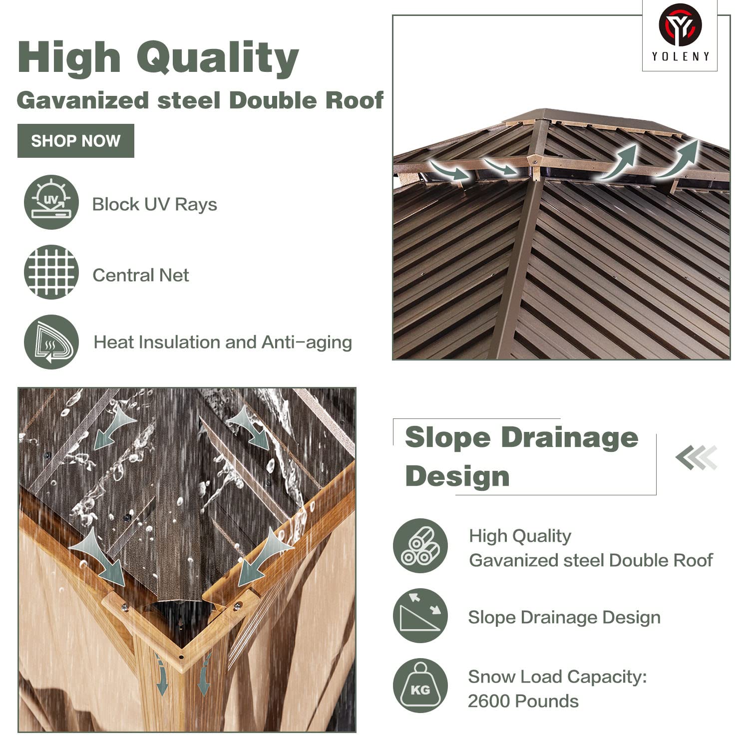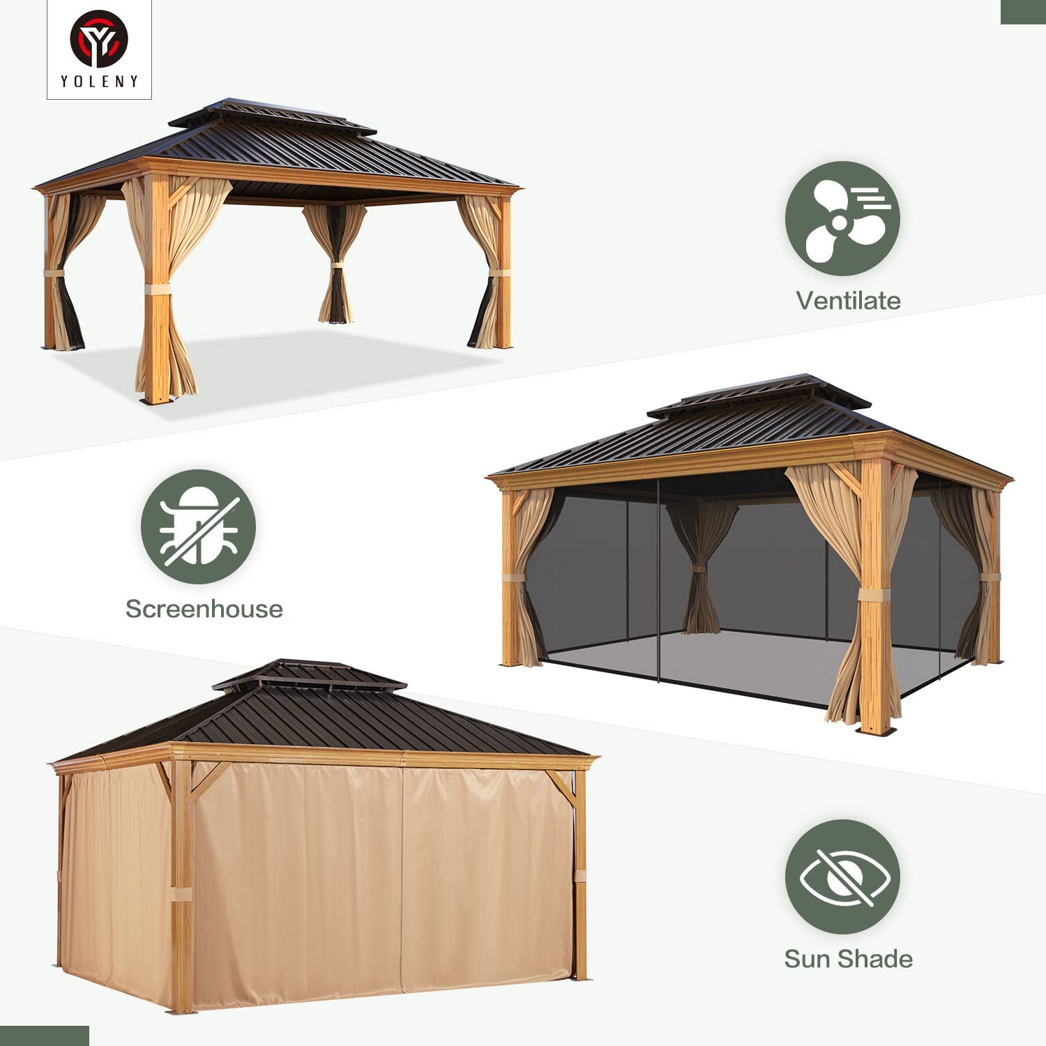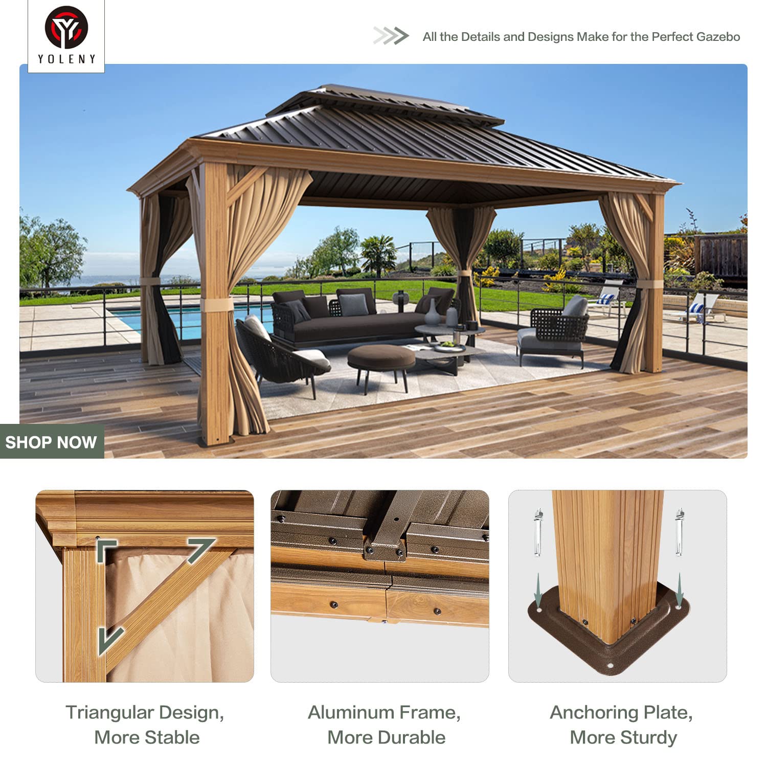YOLENY 12' x 16' Gazebo, Hardtop Wood-Looking Gazebo with Galvanized Steel Double Roof, Aluminum Frame with Netting and Curtains for Deck, Backyard, Patio, Lawns