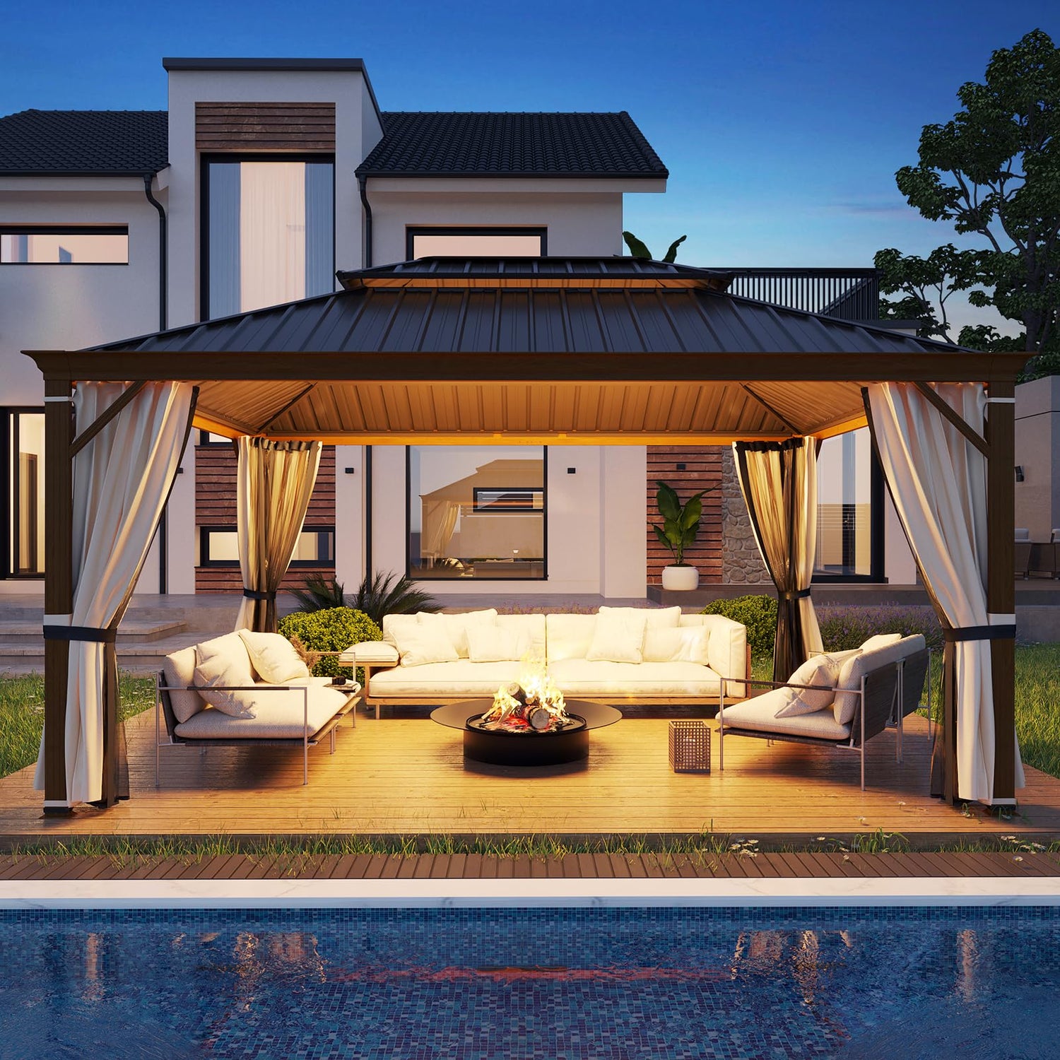 YOLENY 12' x 16' Hardtop Gazebo Faux Wood Grain Metal Gazebo with Aluminum Frame, Galvanized Steel Double Roof, Outdoor Patio Gazebo Pergolas with Netting and Curtains for Backyard, Patio, Lawns