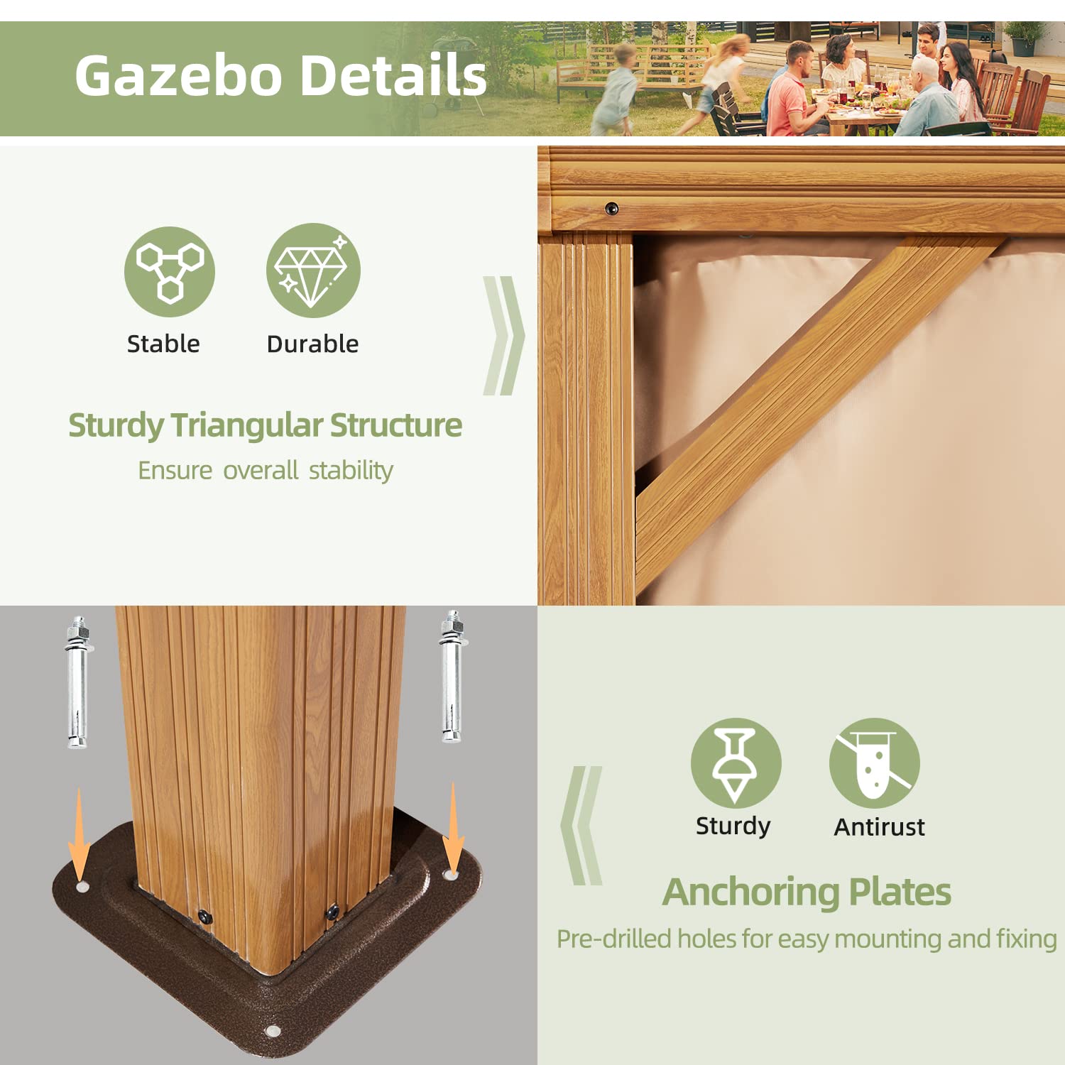 YOLENY 12' x 16' Hardtop Gazebo Metal Gazebo with Faux Wood Grain Aluminum Frame, Galvanized Steel Single Roof, Outdoor Patio Gazebo Pergolas with Netting and Curtains for Backyard, Patio, Lawns