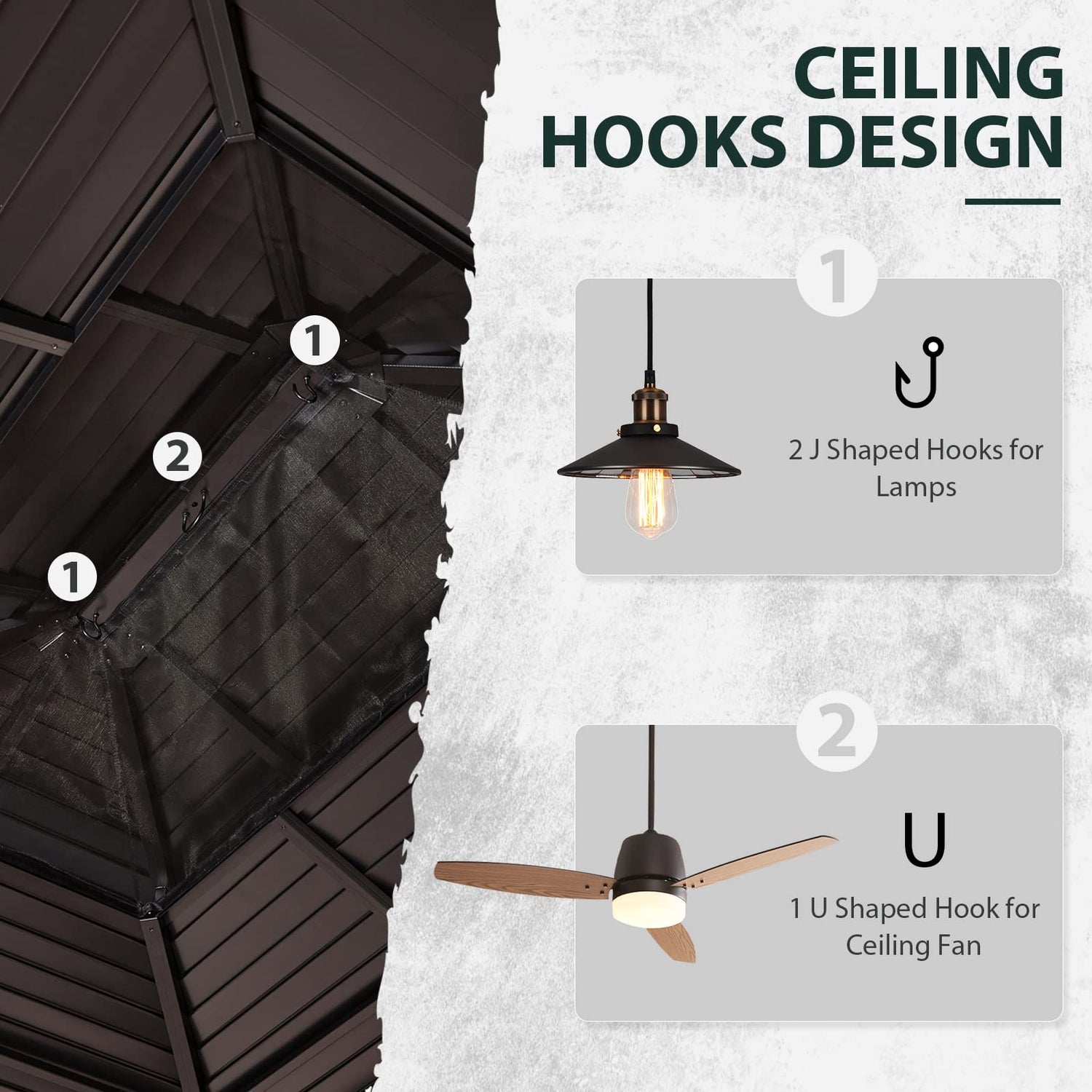 - 【DOUBLE-ROOF DESIGN】The outdoor gazebo adopts a ventilated double-roof to ensure air circulation while greatly enhancing stability in strong wind conditions. Inside the roof, there are two J-shaped hooks for hanging lights and one U-shaped hook for hanging fans, providing convenience for your lighting and ventilation.