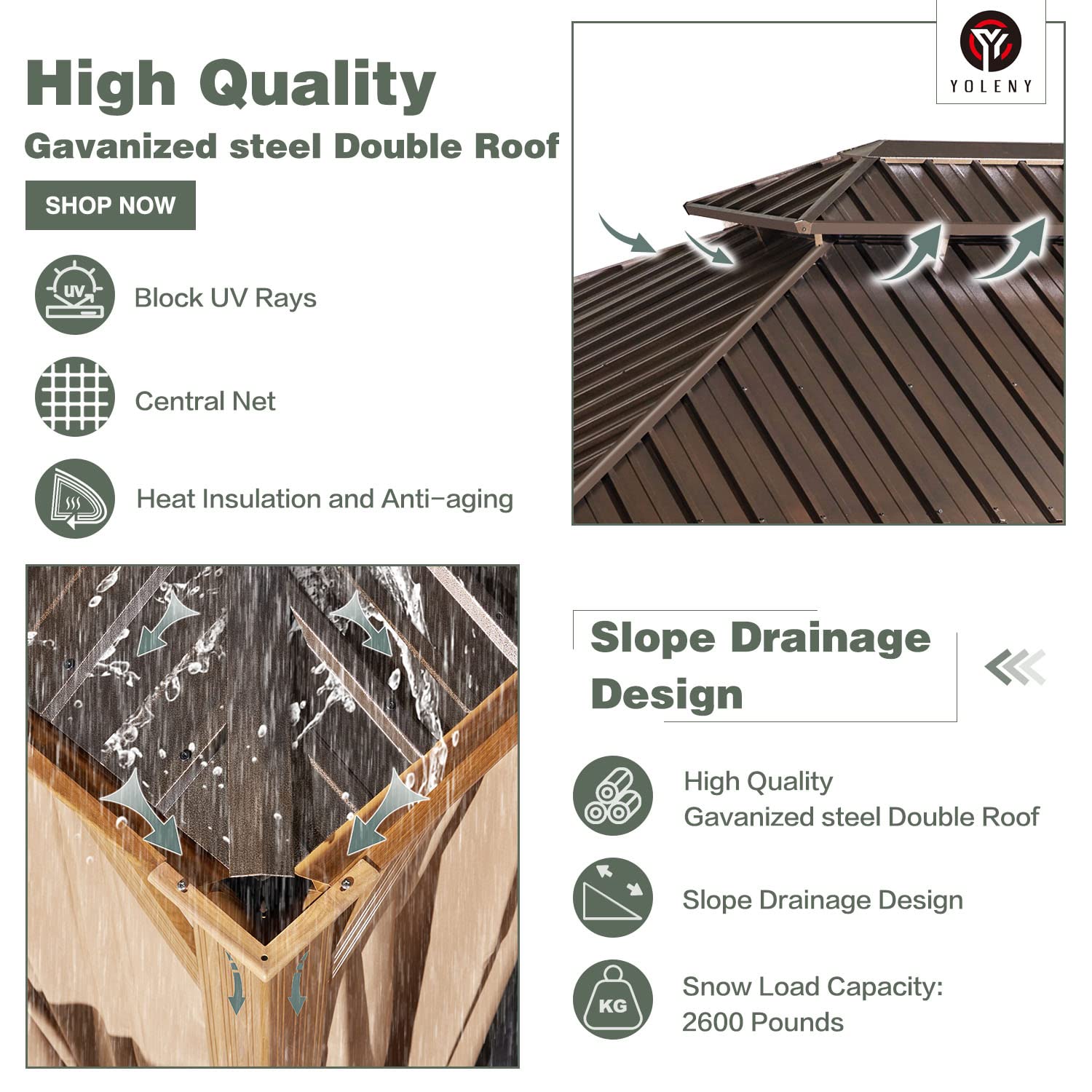 YOLENY 12' x 20' Hardtop Gazebo Wood Grain Gazebo with Galvanized Steel Double Roof, Aluminum Frame, Outdoor Patio Hardtop Gazebo with Netting and Curtains for Deck, Backyard, Patio, Lawns