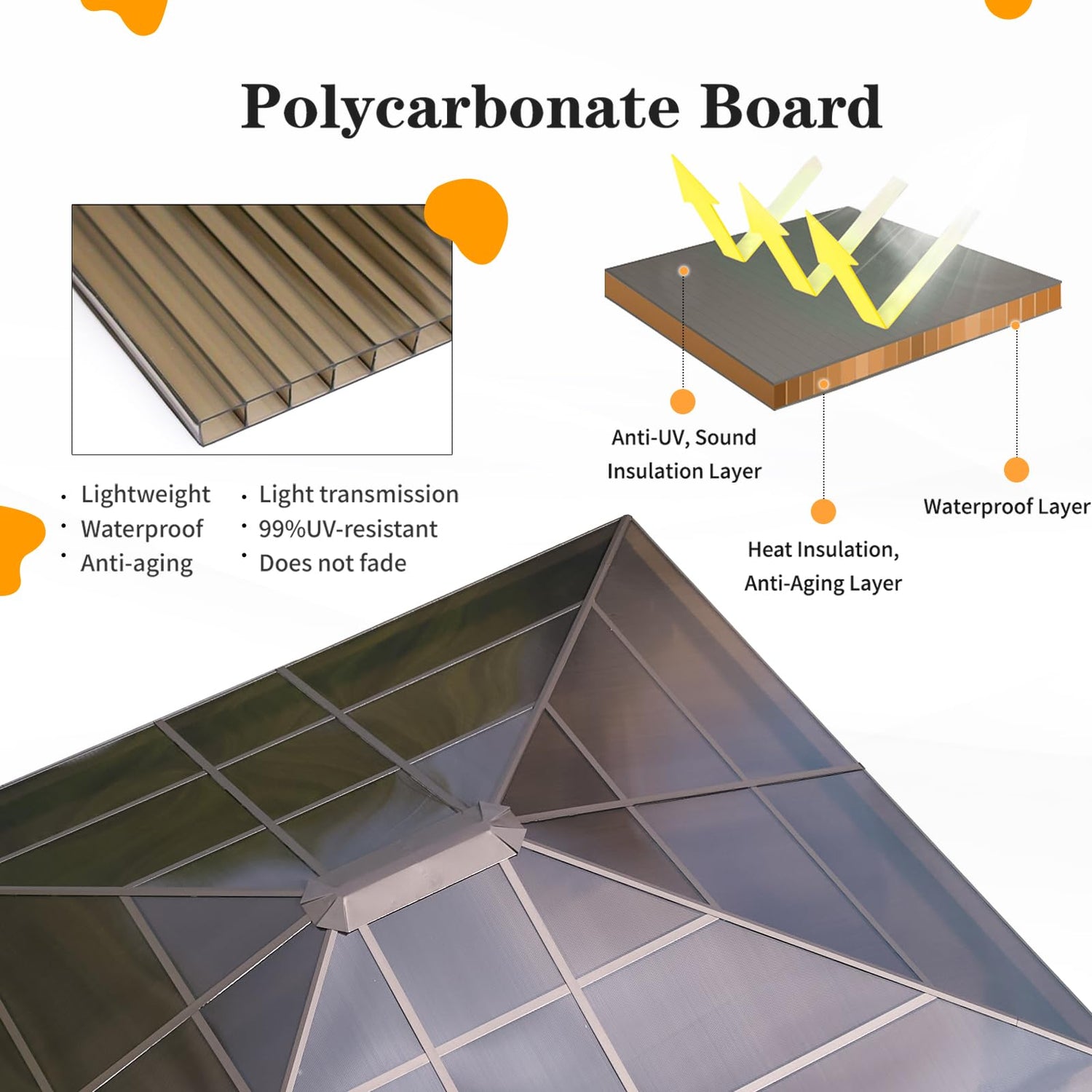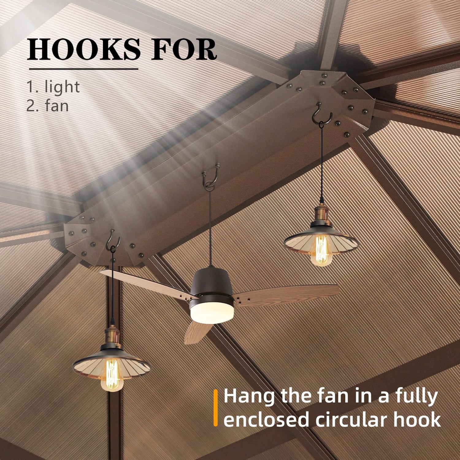 - LASTING DURABILITY: This hardtop gazebo is equipped with a polycarbonate roof and strong triangular powder-coated aluminum frames. The incorporated ceiling hooks can be used for additional lights and fans. The sleek overhang roof design reduces rainwater gathering while preventing harmful UV rays. You can sunbathe under this pavilion without worrying about getting sunburned. *Please note that the polycarbonate roof can only block UV rays, not high temperatures and strong light.