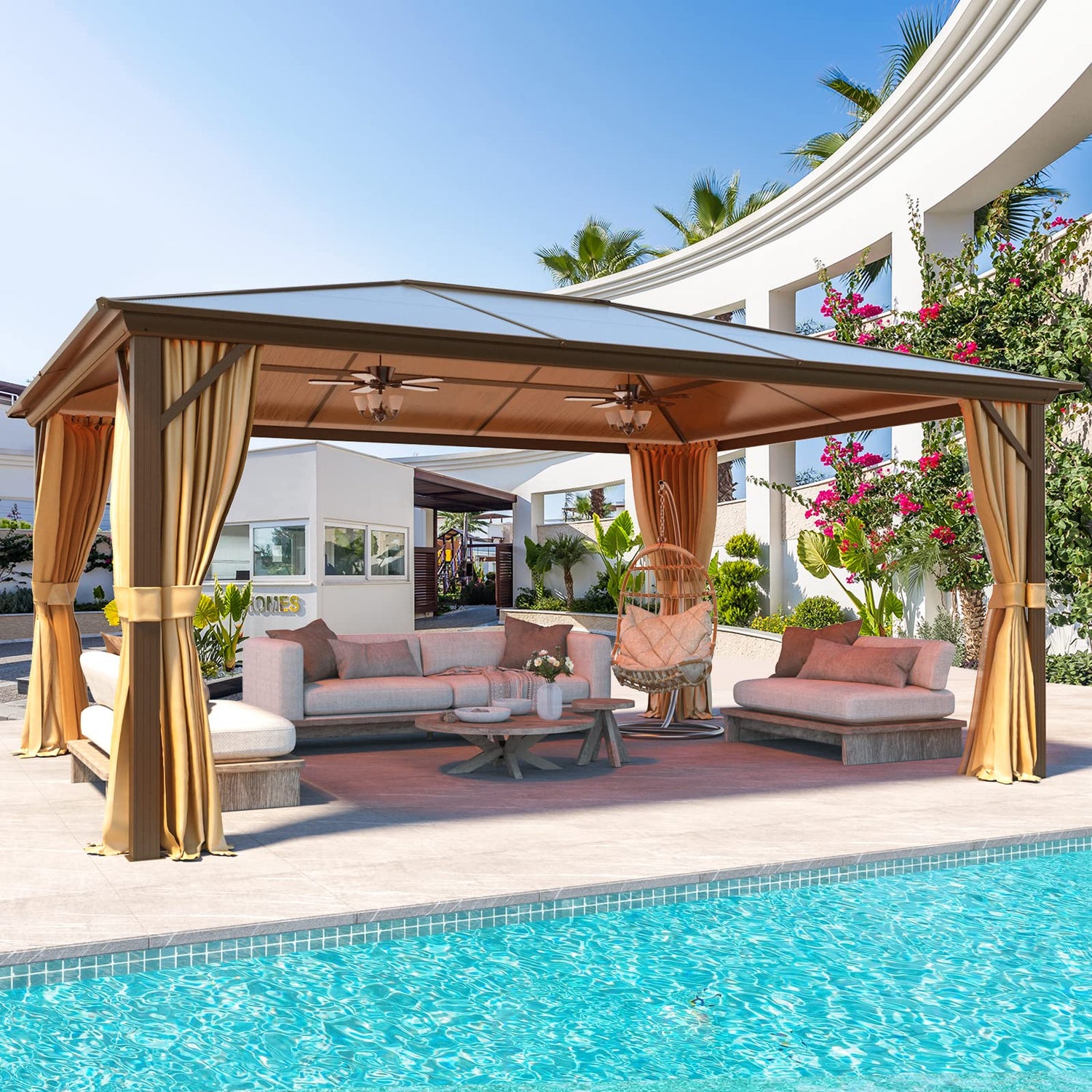 - LASTING DURABILITY & UV99: This hardtop gazebo is equipped with a polycarbonate roof and strong triangular powder-coated aluminum frames. The incorporated ceiling hooks can be used for additional lights and fans. The sleek overhang roof design reduces rainwater gathering while preventing harmful UV rays. You can sunbathe under this pavilion without worrying about getting sunburned. *Please note that the polycarbonate roof can only block UV rays, not high temperatures and strong light.