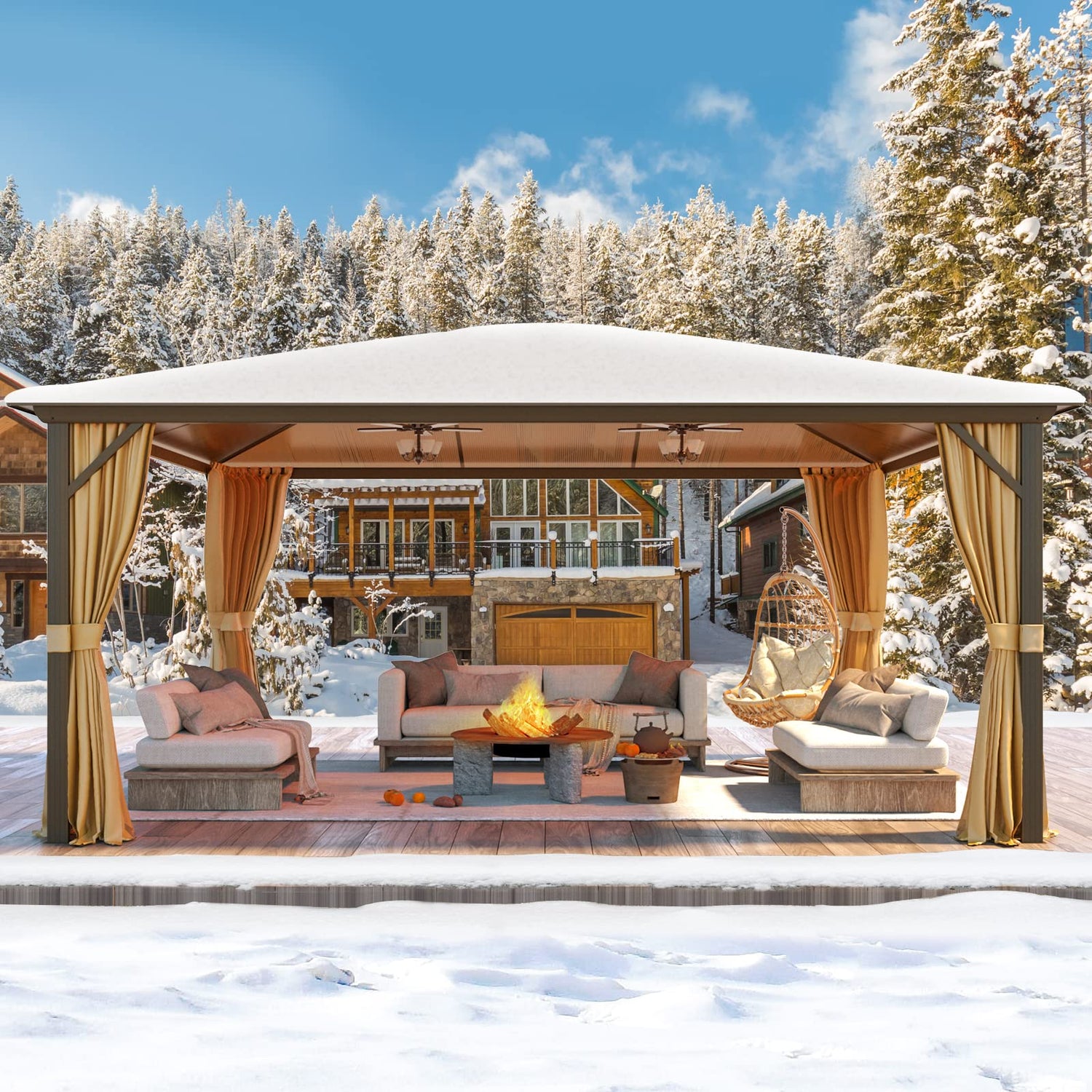 YOLENY 12'x16' Hardtop Gazebo, Outdoor Polycarbonate Roof Canopy, Aluminum Frame Permanent Pavilion with Curtains and Netting, Sunshade for Garden, Patio, Lawns, Khaki