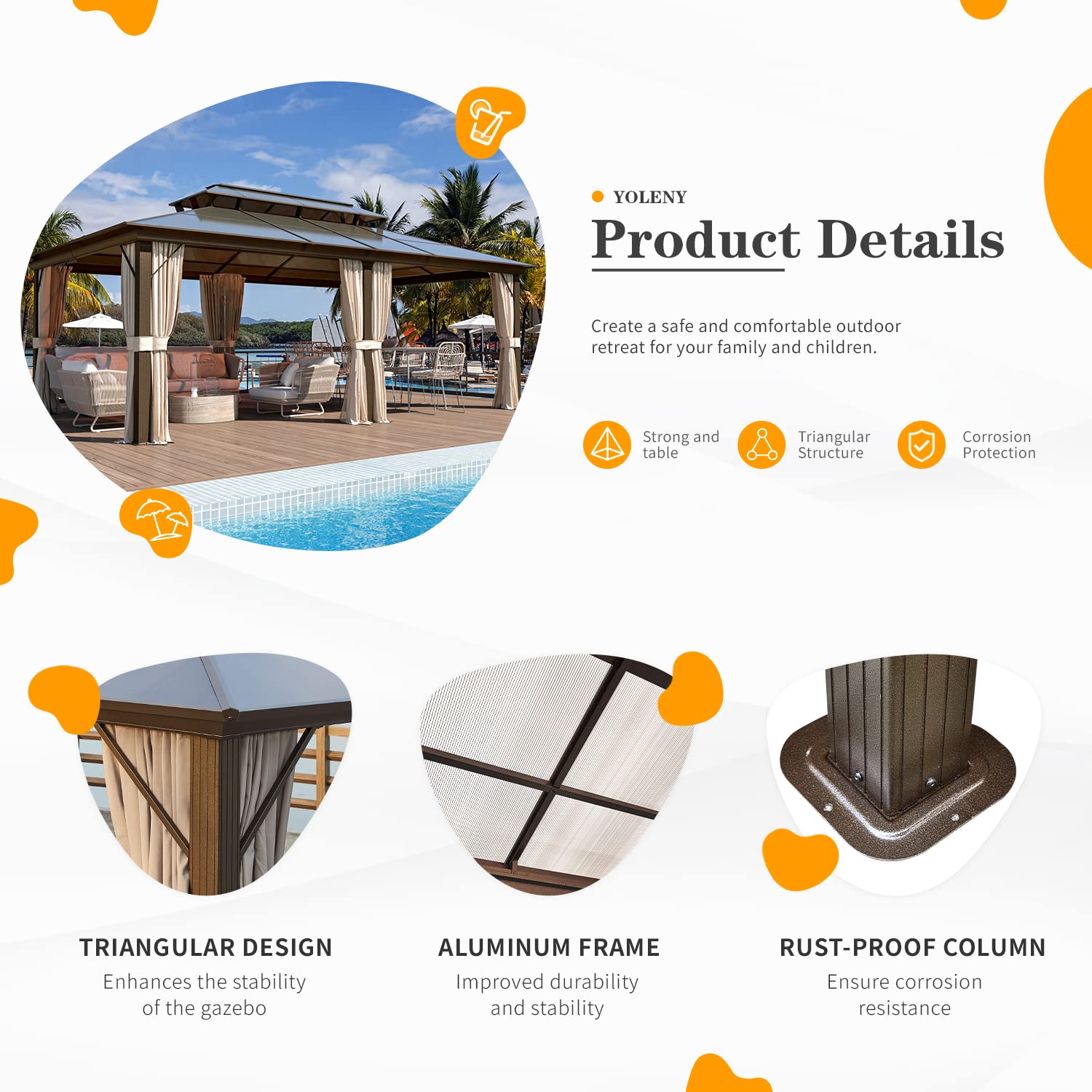 YOLENY 12'x20' Hardtop Gazebo, Outdoor Polycarbonate Double Roof Canopy, Aluminum Frame Permanent Pavilion with Curtains and Netting, Sunshade for Garden, Patio, Lawns
