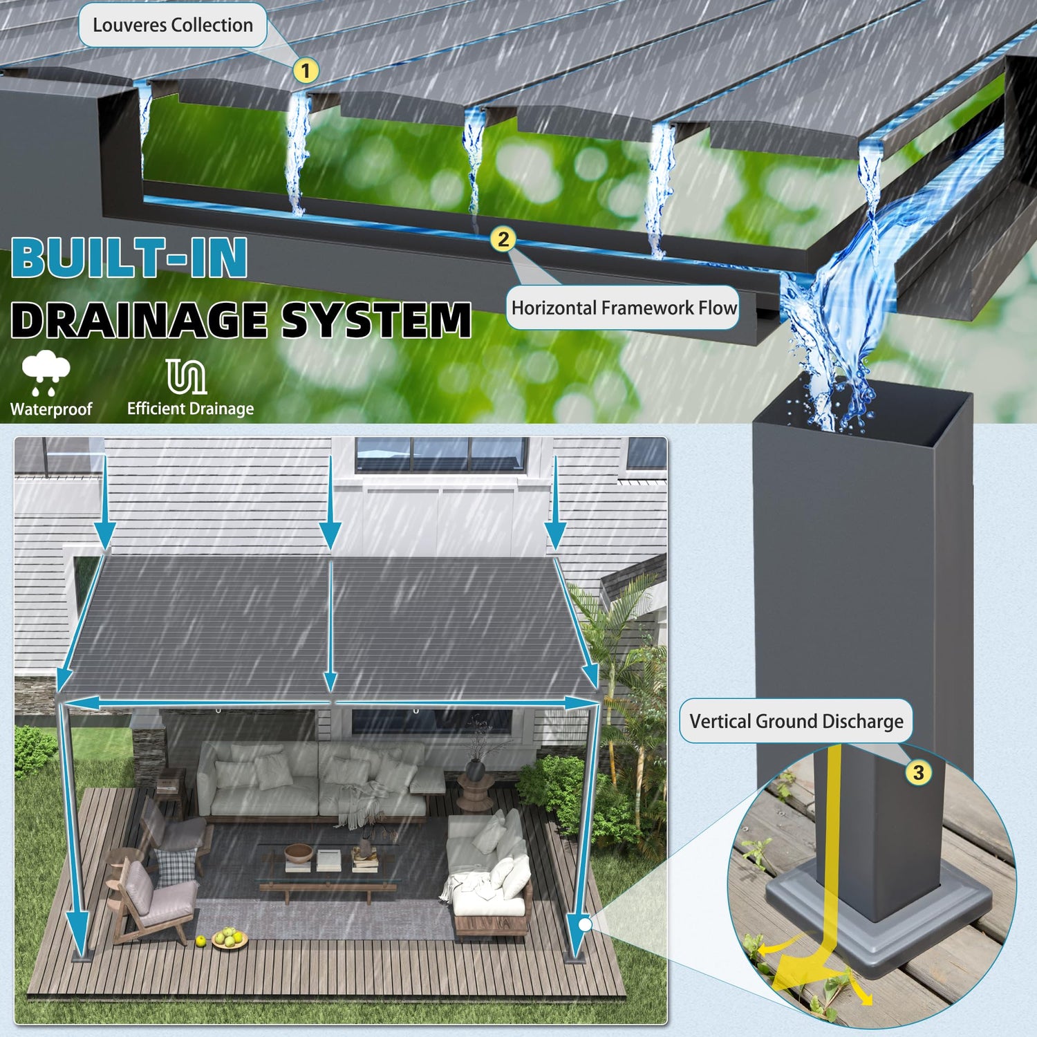 - CONCEALED DRAINAGE SYSTEM: The hard top roof features a natural, slight incline to facilitate drainage. Rainwater effortlessly drains through purposefully designed channels within the beams, then flows down through the legs, exiting at the base and dispersing into the ground it's anchored to. This effective drainage mechanism prevents roof water accumulation, ensuring a dry space underneath.