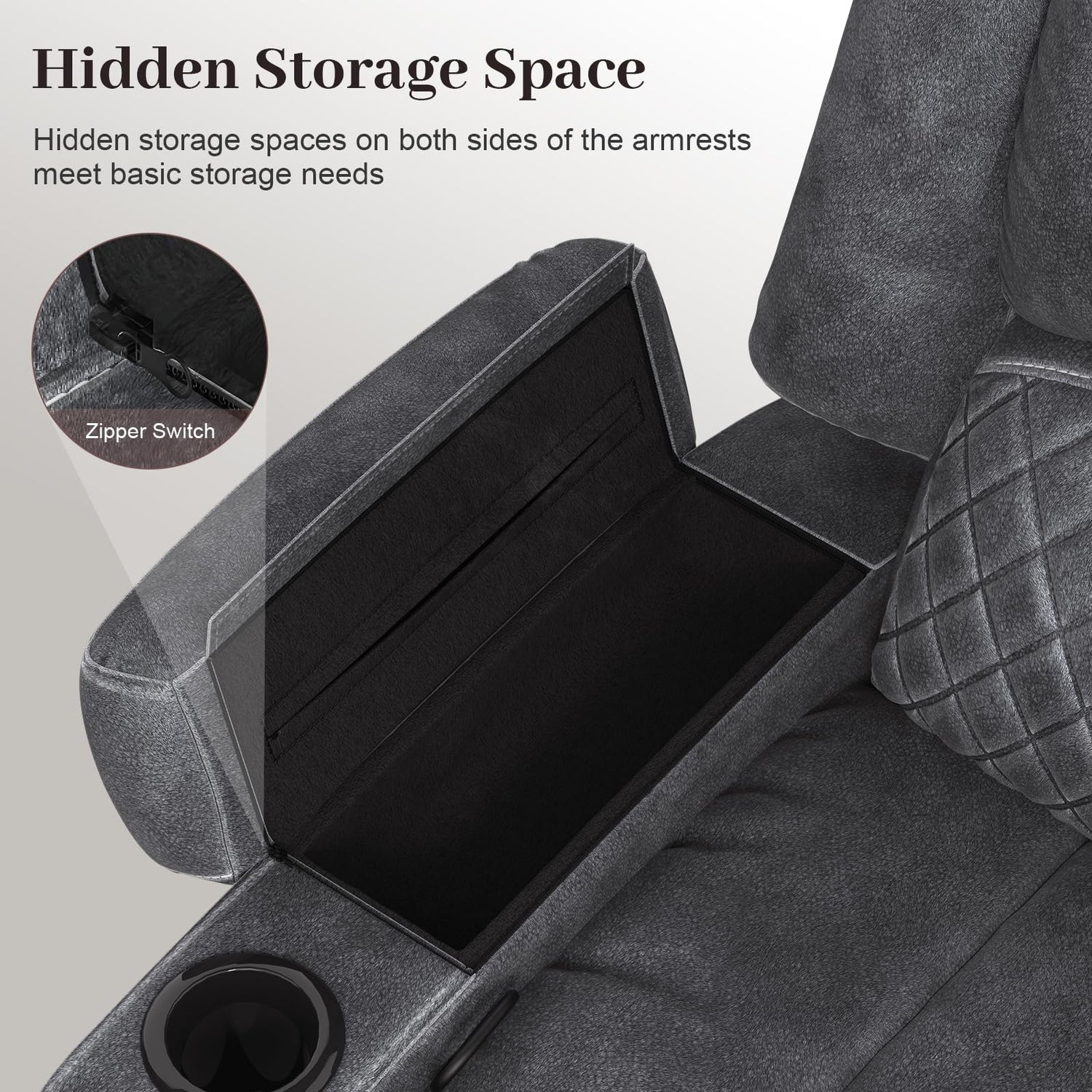 - Hidden Storage Space: Surprisingly, there are hidden storage spaces on both sides of the armrest of the double recliner. They adopt a zipper switch design with optional opening sizes. Moreover, the entire armrest can be flipped open to accommodate snacks, newspapers, etc., fully meeting the storage needs of the seat.