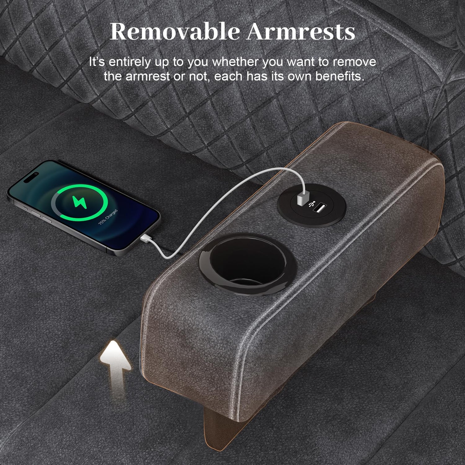 - Removable Armrest: In order to meet the customized needs of more users, the middle armrest of our recliner love seat can be easily disassembled. Installing the armrest can provide you with additional cup holders and 2 USB charging ports, making the entire sofa more functional. Of course, dismantling it also has its benefits, as the space is more spacious and you are closer to your loved one without being hindered.