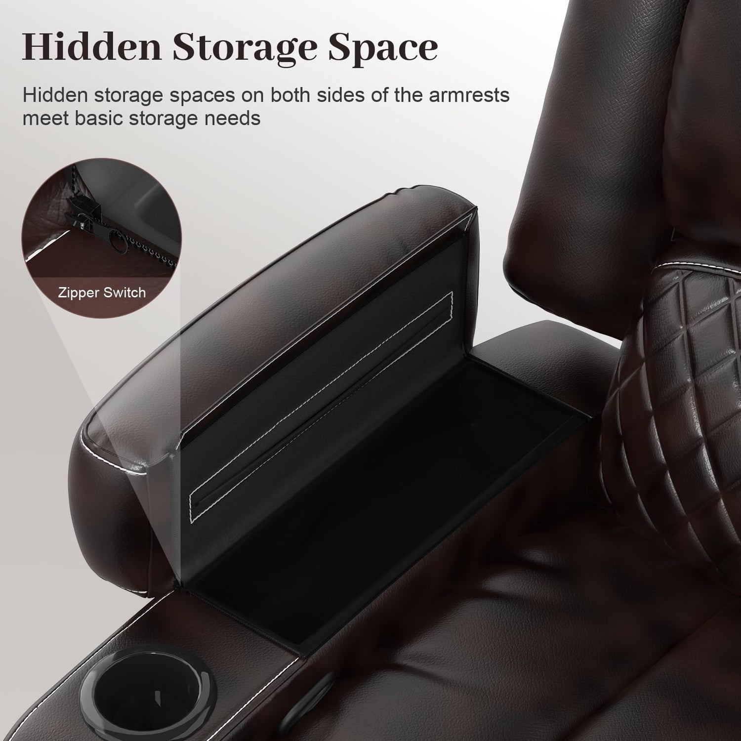 - 【Hidden Storage Space】There are hidden storage spaces on both sides of the armrests of the recliner love seat and recliner for living room. They use a zipper switch design and the opening size is optional. Not only that, the entire armrest can be flipped open, allowing you to place taller food such as wine bottles, it can fully meet the storage needs on the seat.