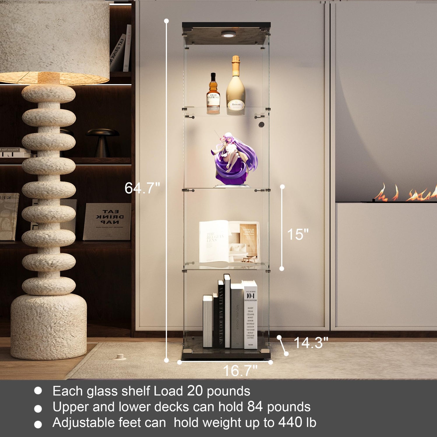 Glass Display Cabinet: Size 64.7"(H) x 16.7"(L) x 14.3"(W) inches, each tempered glass is 4mm thick. 4-shelf design is sturdy and stylish to display photos, books, action figures, wine and whisky; glass door is easy to open and close. Two colors available: White, Black