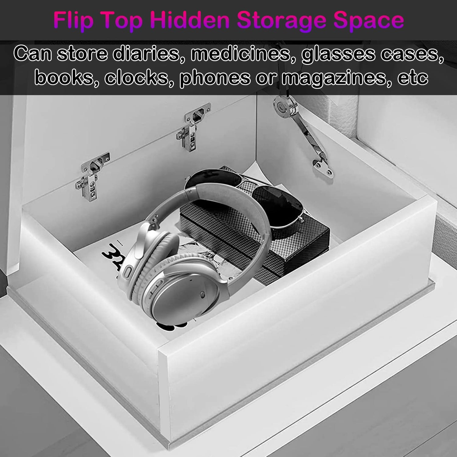 - 【Ample Storage and Display Space】2 drawers provide ample storage space for your personal items, such as diaries, medicines, glasses cases, books, clocks, phones or magazines, etc. The top of the LED nightstand can be flipped up to add extra storage space. Working on smooth side rails, the practical drawers can be easily pulled in or out. Table top is perfect for displaying lamps, clocks, potted plants or photo frames for a warm and personalized decor