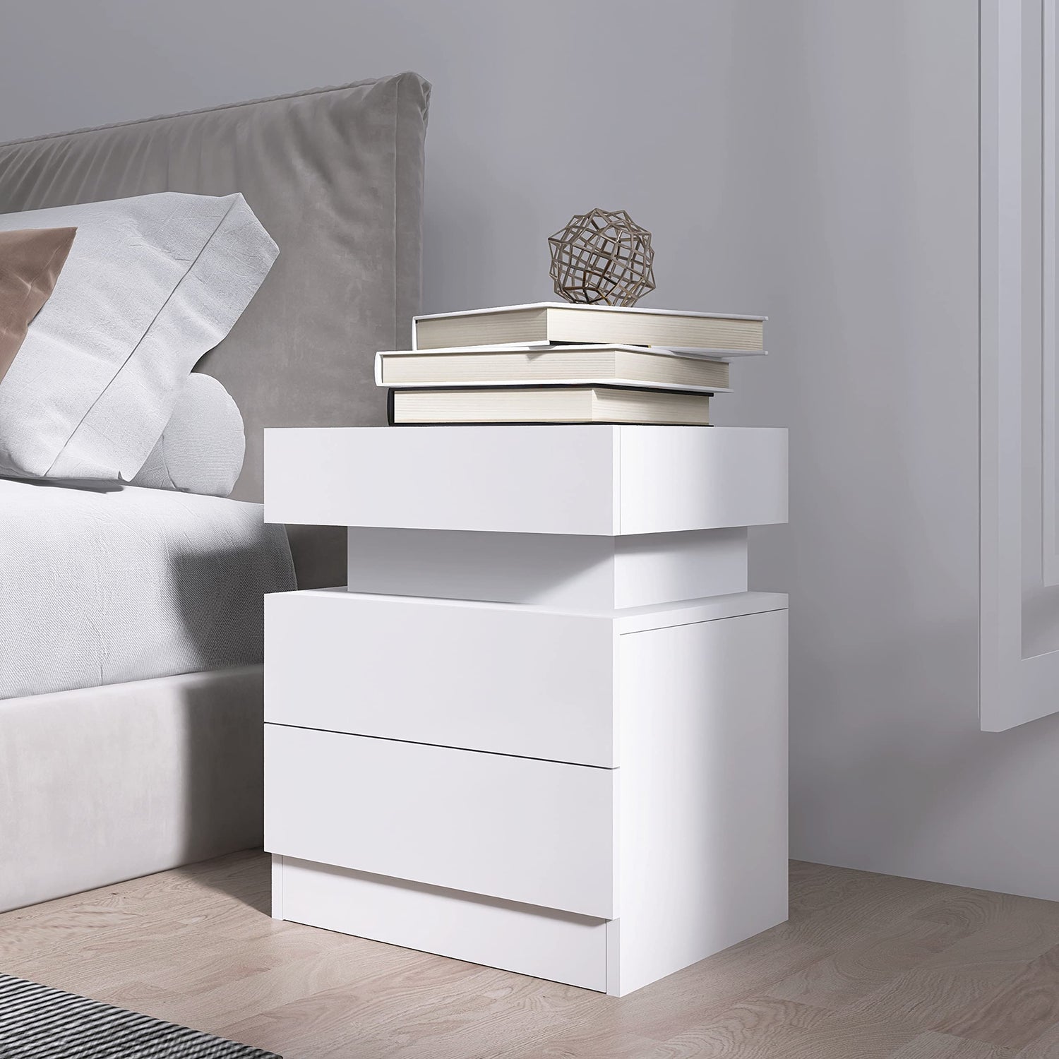 - 【Modern 2-Drawer LED Nightstand】Inspired by modern style, this drawer nightstand adds a touch of chic beauty while providing convenient storage space for your bedroom, hallway, living room and more. The LED nightstand has 16 RGB color, 4 flashing modes and brightness adjustment. Colorful lights make your bedroom more attractive. With clean lines and a rectangular high gloss body, the space-saving side table will easily blend into your existing decor. This bedroom nightstand has a modern minimalist elegance and gives it a stylish feel