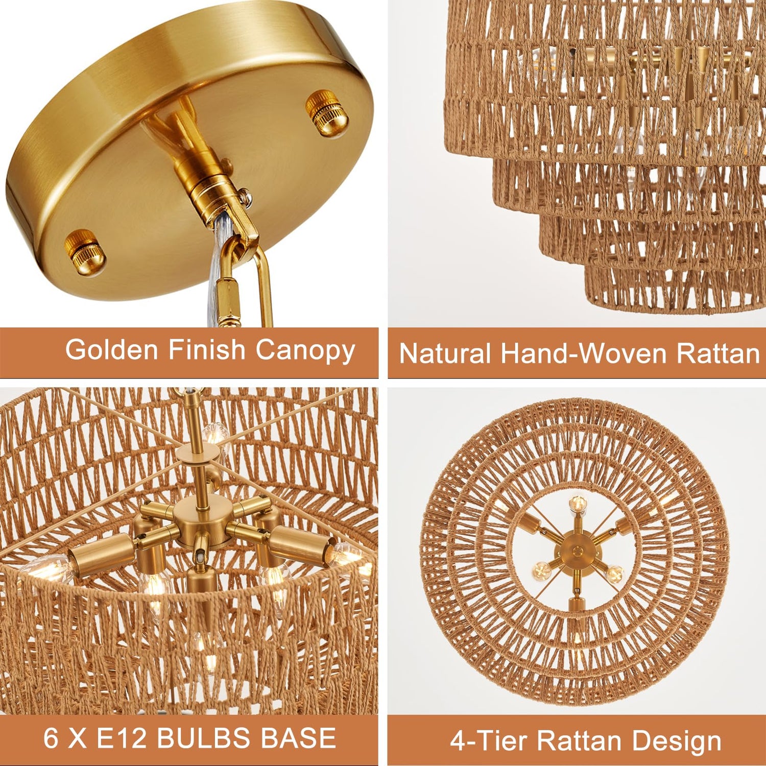 - 【4-Tier Drum Design】The 6-light rattan chandelier's simple wicker weave and golden finish metal frames bring a vintage bohemian style. This boho rattan chandelier light fixture features four round metal frames that form a captivating circular hollow cage. This design sets it apart, adding an element of sophistication.