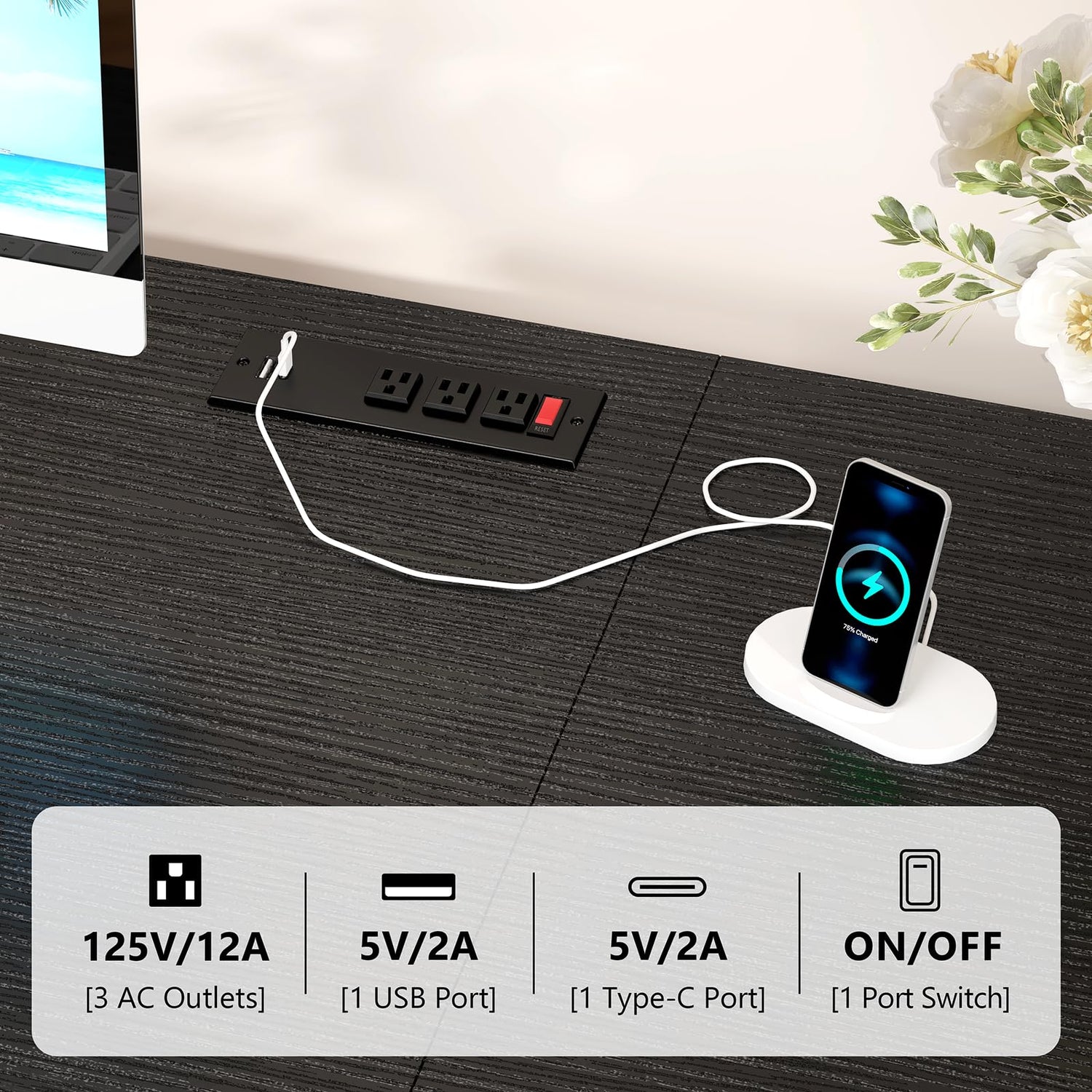 - [INTEGRATED POWER STRIP]: The computer desk with 8 drawers is equipped with integrated power strip, including 1 USB port, 1 TYPE-C port, 3 built-in AC outlets, and a ON/OFF switch, which provides power support for your computer, tablet and phone and keeps your gaming equipment always powered up