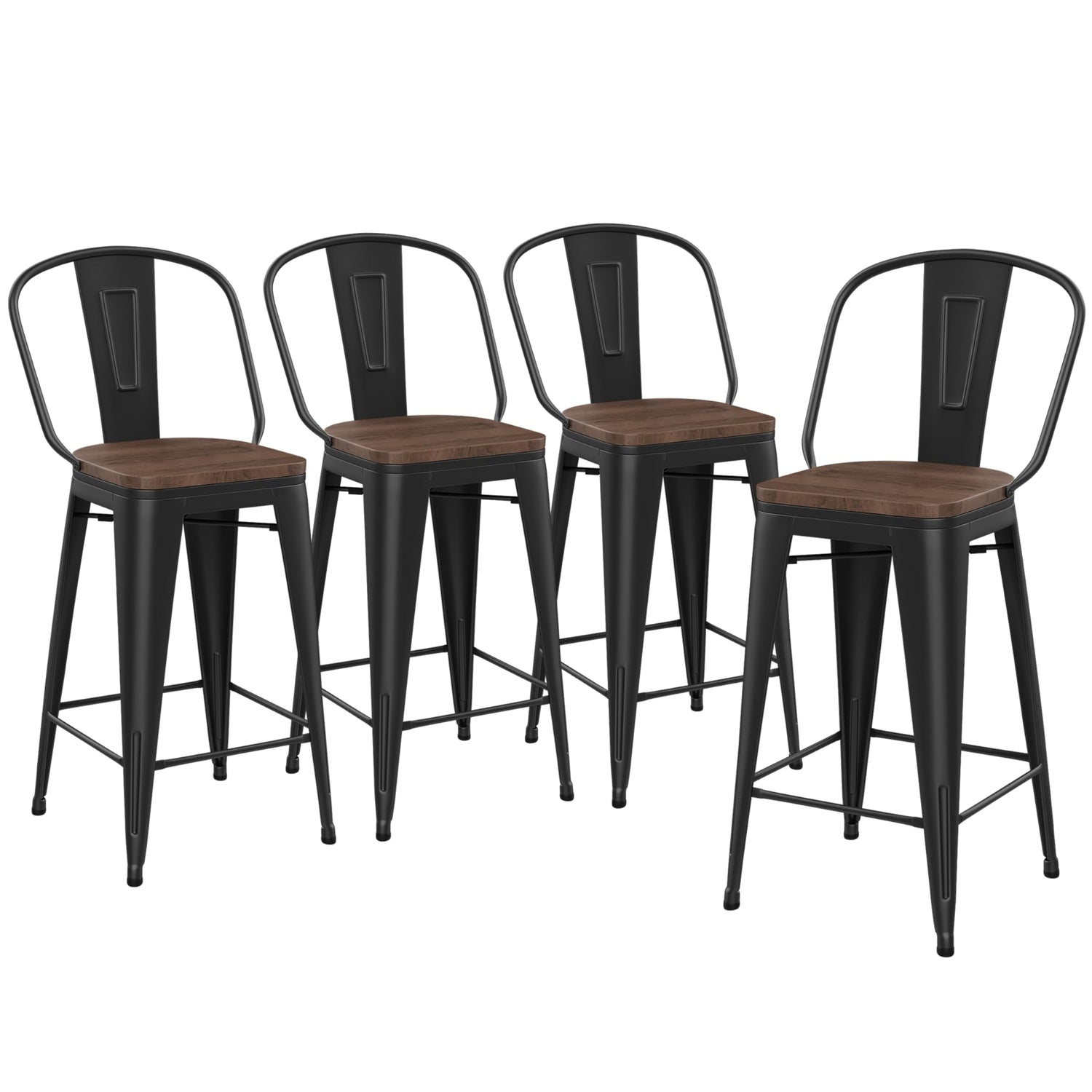Yongqiang 26 inch Bar Stools Set of 4 High Back Metal Kitchen Counter Height Chairs Barstools with Wooden Seat Industrial Matte Black