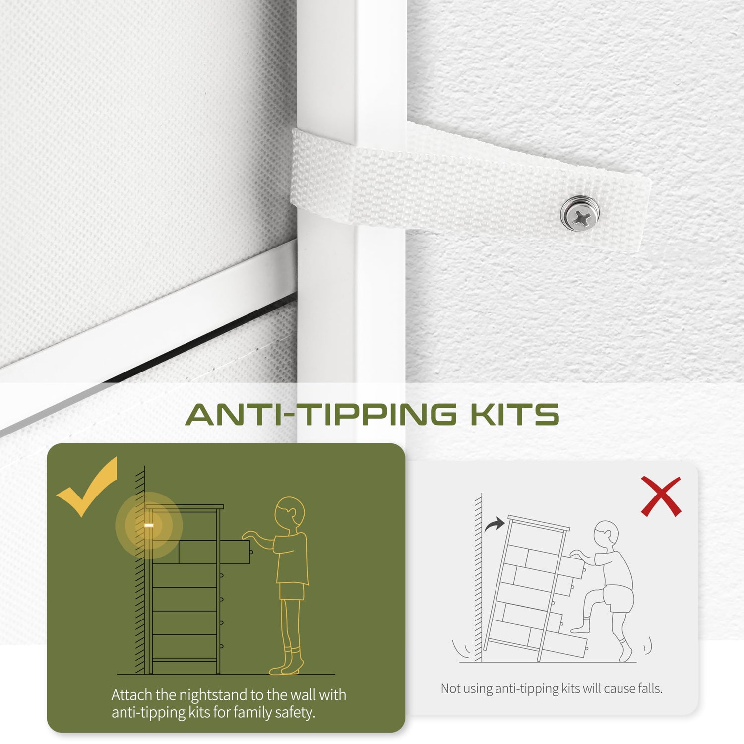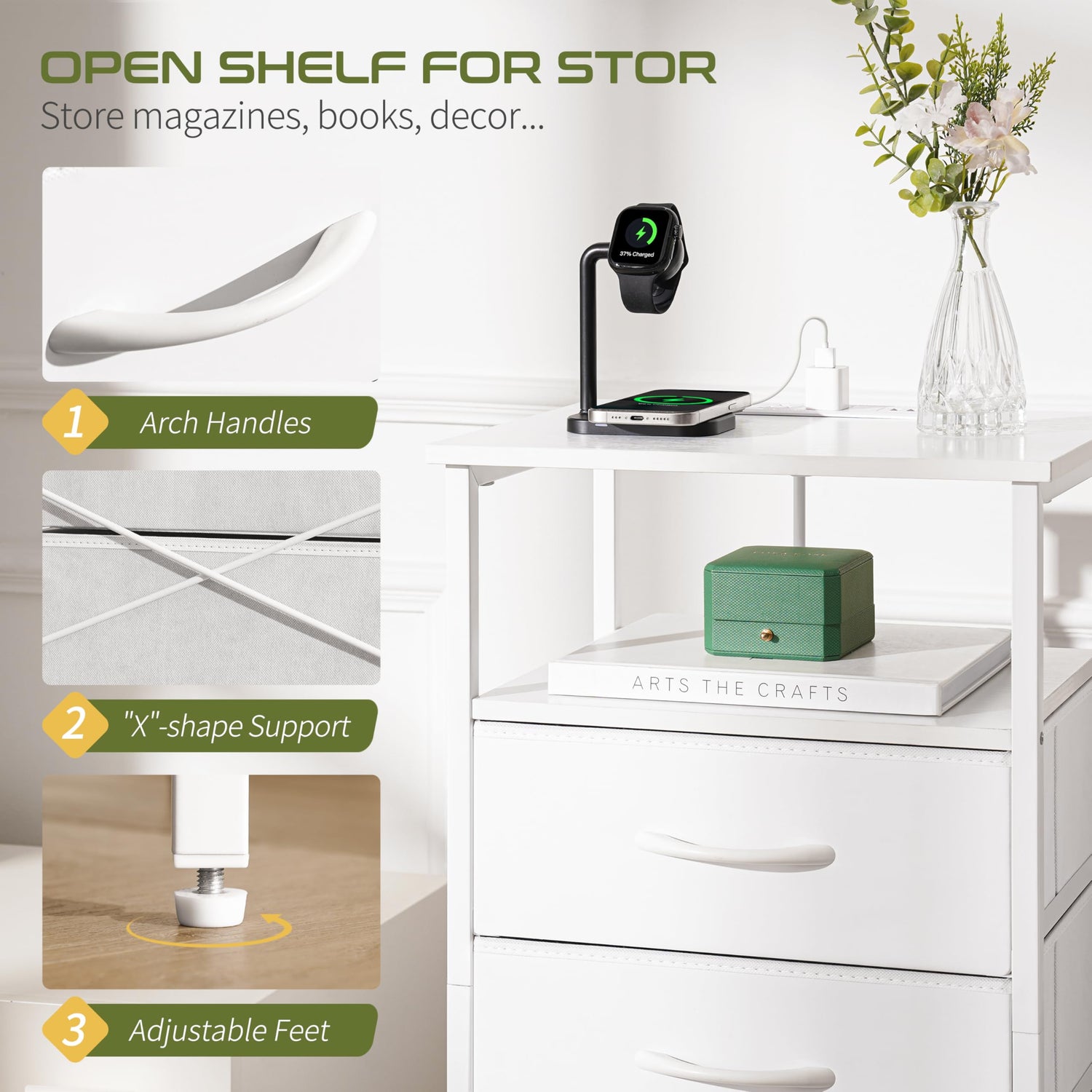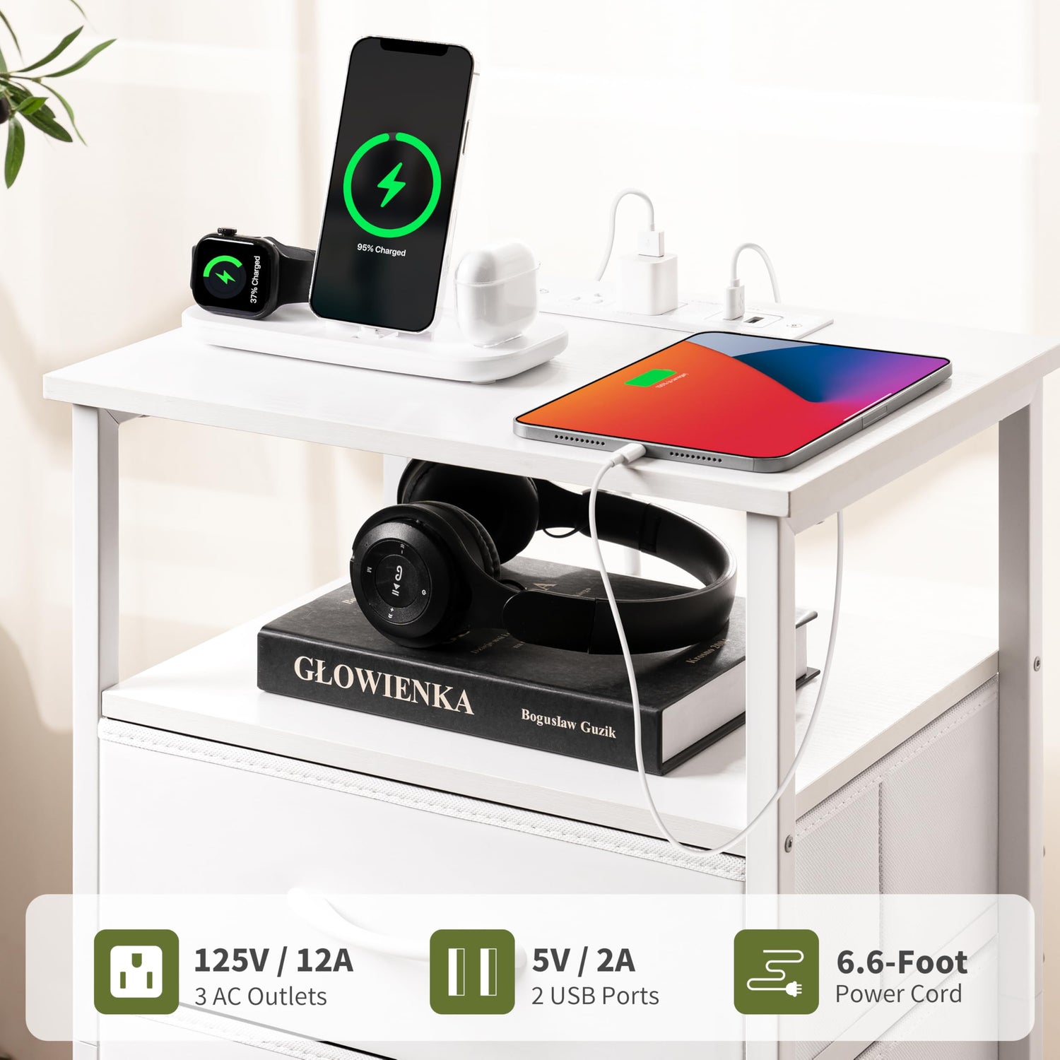 - Night Stand with Charger Station: The white dresser with built-in outlet is a game-changer: no more struggling with power supply for your steam iron, lamp, phones... With 2 AC outlets & 2 USB ports, the small dresser with drawers accommodates various plug types, catering to more daily needs and scenarios.