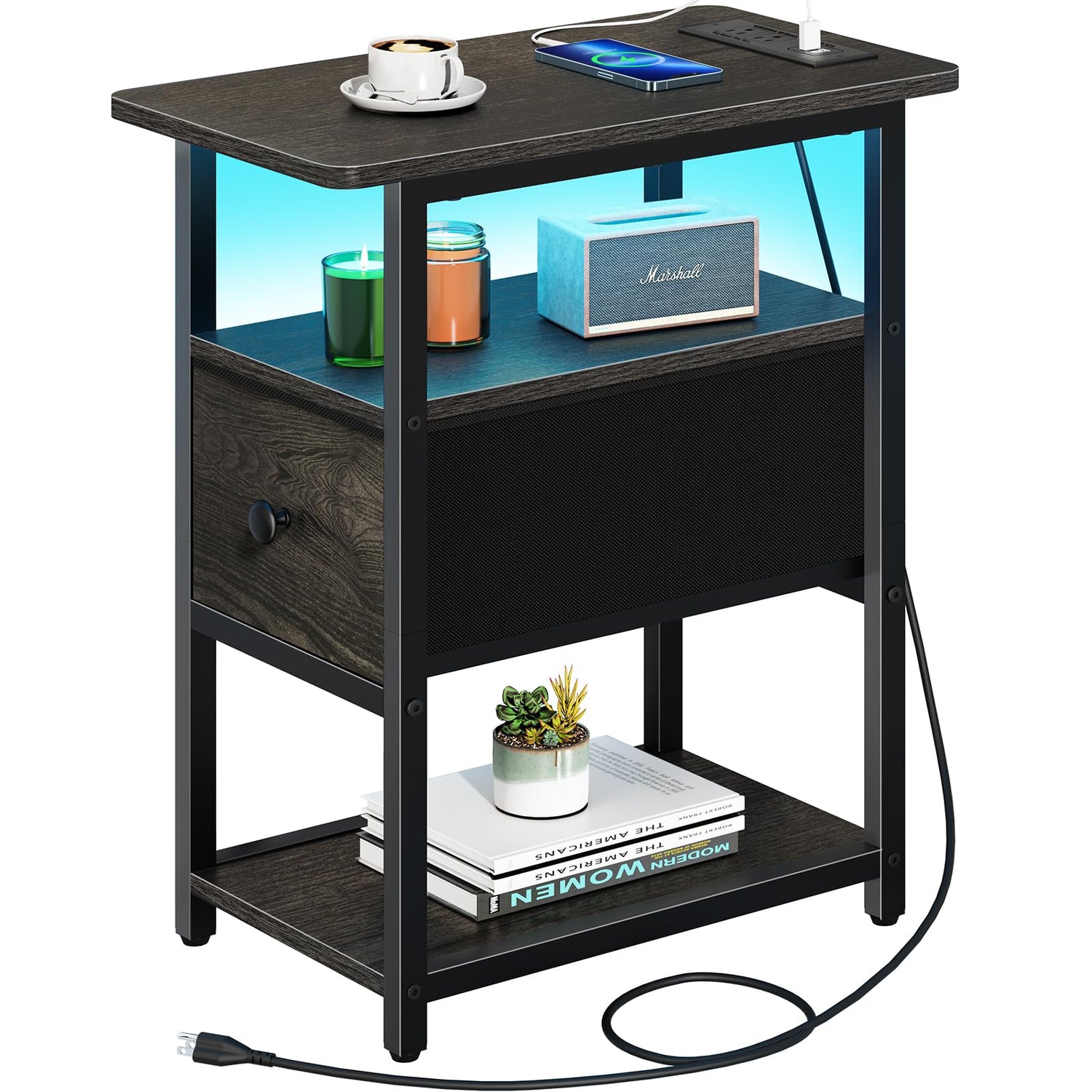 Yoobure End Table with Charging Station, Narrow Side Table with Adjustable Fabric Drawer, 3-Tier End Tables Living Room, Small Nightstand with Outlets, LED Skinny Night Stand for Bedroom Small Spaces