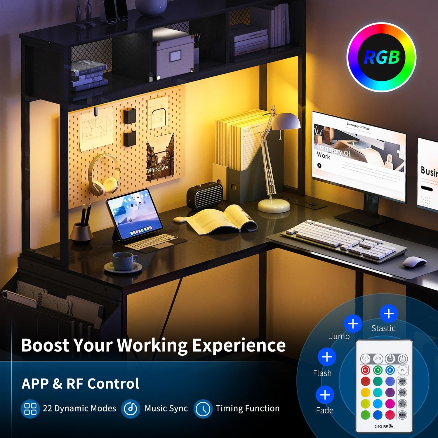 - âšăGaming Table with Smart LED LightăOur L-shaped gaming desk with RGB LED lights creates more fun for gaming enthusiasts, which features over 60000 colors and 29 flashing modes via APP or remote control. Built-in music sync function can change the light color with the rhythm of sound and music, make your life chill. And with timer function, the LED lights will stay in the last mode when turned on. Choose your favorite color and mode, let the game begin!