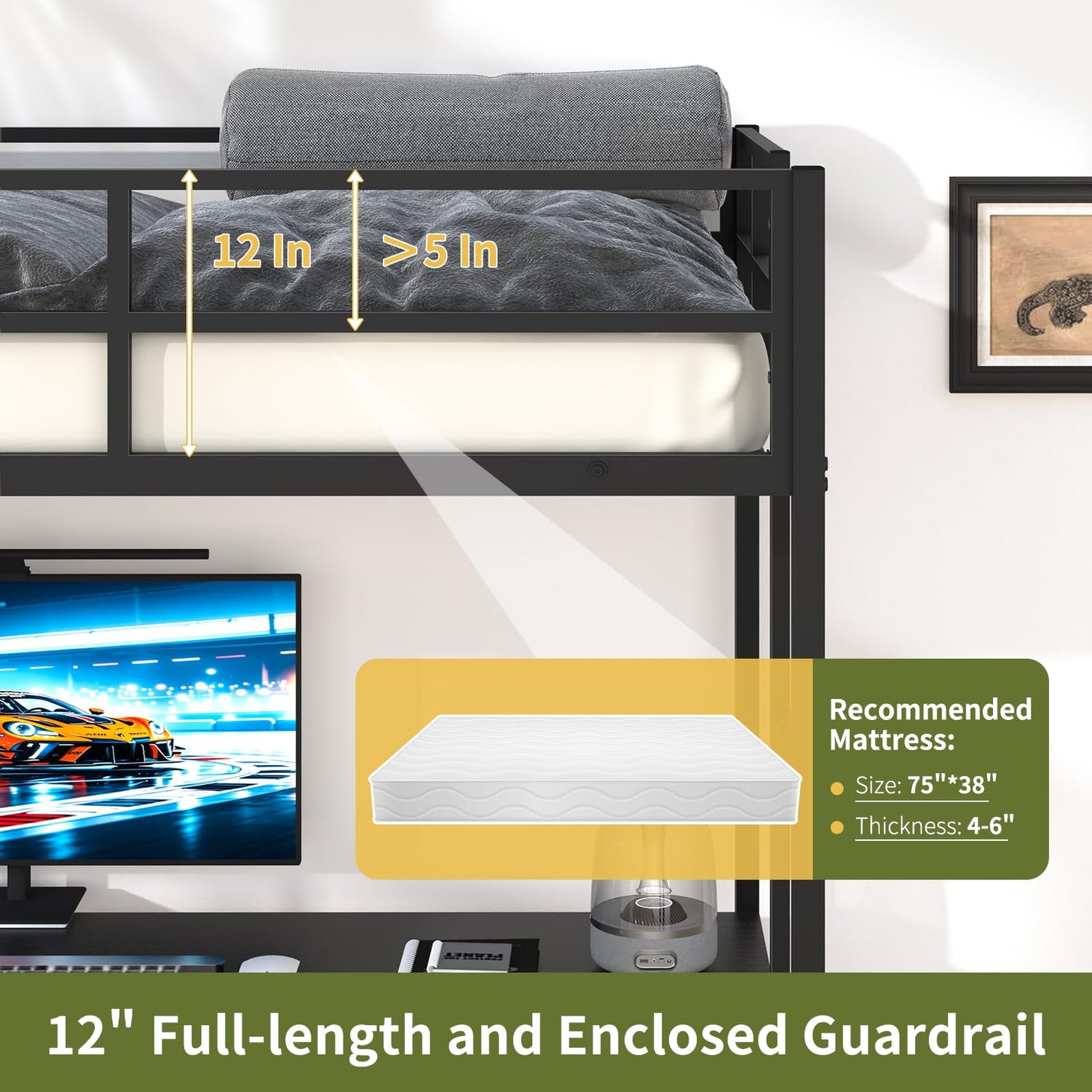 - 😺【Safety Assurance】The thickened frame combines with good welding, forming a sturdy & heavy-duty bunk bed with desk to support 550lbs. Precise holes tightly fitted with parts, promising No Noise & Wobble for your deep sleep. Add that full-length guardrail, stronger ladder, and anti-tip kit to enhance your safety assurance—recommended mattress 4-6inch. No Box Spring is Needed.