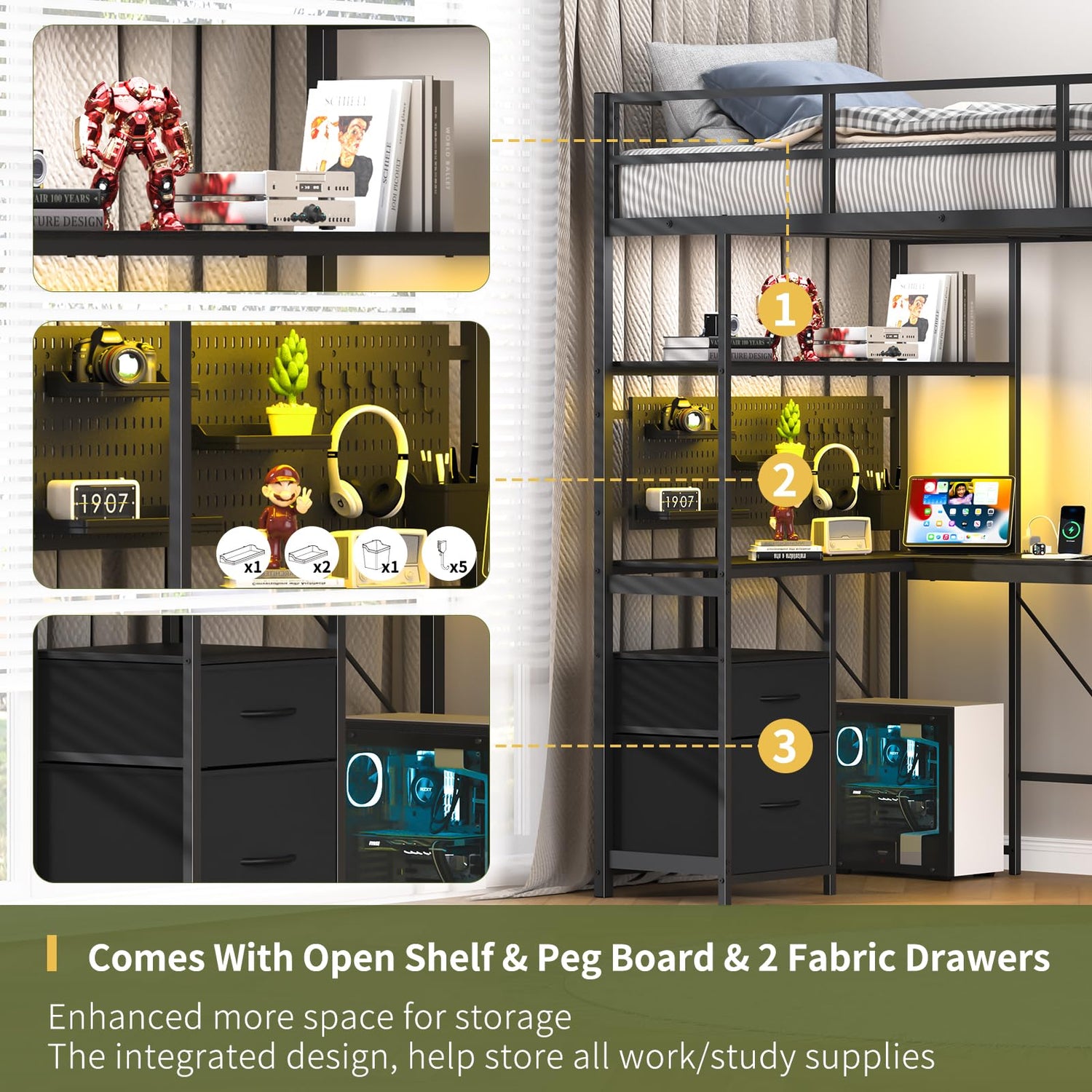 Yoobure Loft Bed Twin Size with L-Shaped Desk, LED Lights Charging Station LED Metal Twin Loft Bed Frame with 2 Storage Drawers, Safety Guard & Ladder for Kid Junior Adult, Heavy Duty, Space-Saving